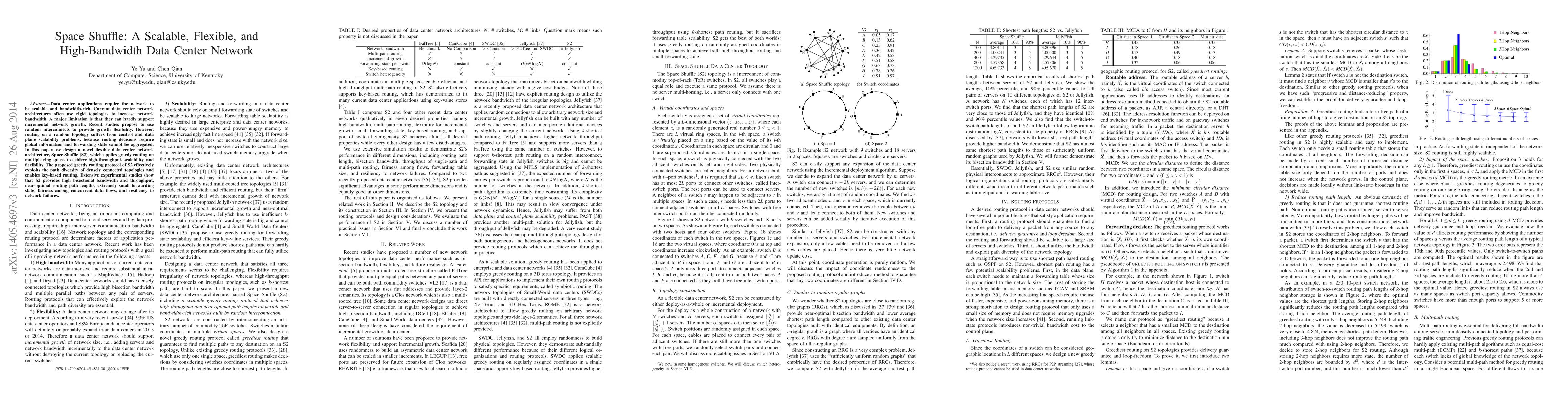 The paper proposes Space Shuffle (S2), a scalable and flexible data center network architecture that uses greedy routing on multiple ring spaces to achieve high-throughput, scalability, and flexibility, while addressing the limitations of current rigid topologies and random interconnects. Experimental results demonstrate S2's high bisectional bandwidth, small forwarding state, and resilience to failures.