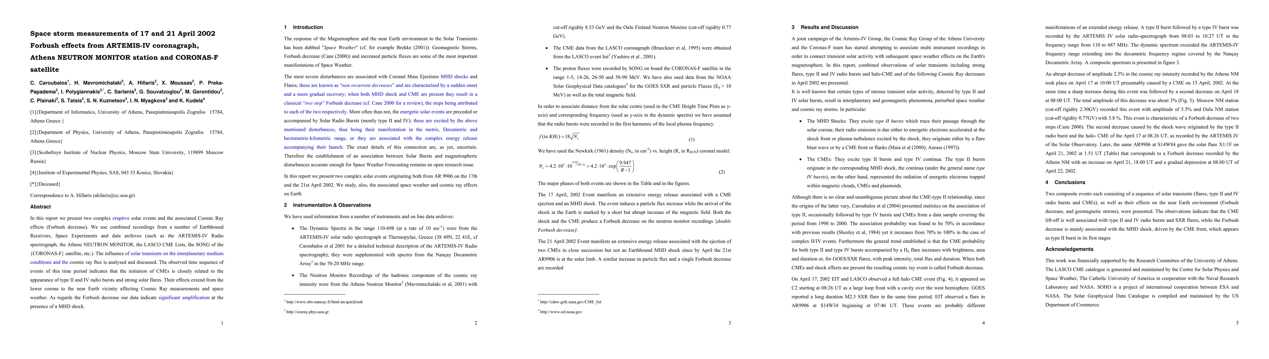 This paper analyzes two eruptive solar events in April 2002, focusing on their Forbush decrease effects on cosmic rays, using data from various instruments including the ARTEMIS-IV Radio spectrograph and the Athens Neutron Monitor. It finds a strong correlation between CMEs, solar flares, and cosmic ray flux alterations, with significant amplification observed in the presence of a magnetohydrodynamic shock.