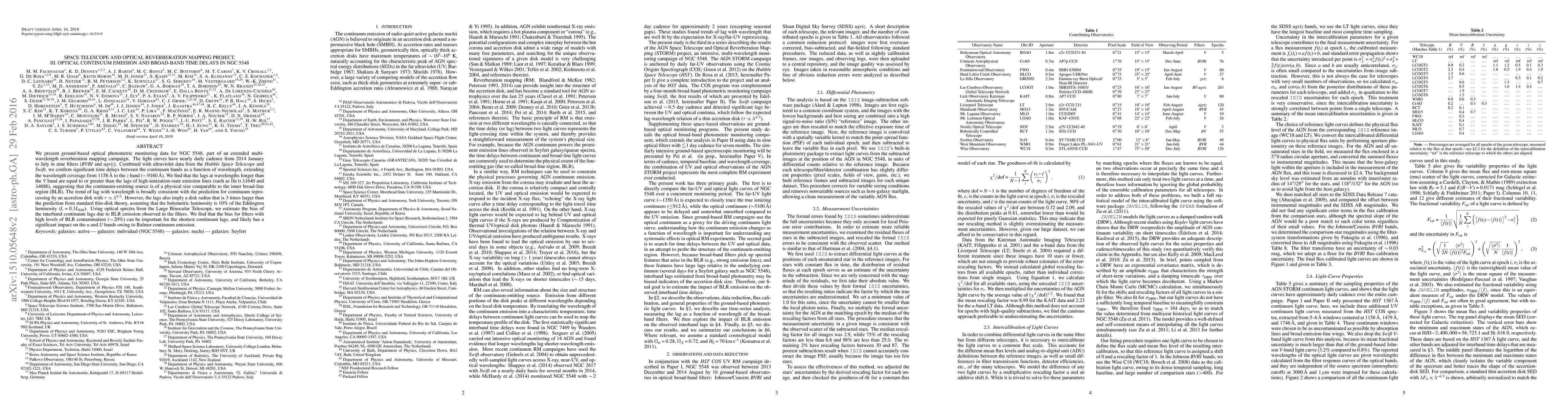 This study presents optical photometric monitoring data for NGC 5548, confirming significant time delays between continuum bands across wavelengths. The lags suggest a continuum-emitting source comparable in size to the inner broad-line region, with a trend consistent with reprocessing by an accretion disk, though the observed disk radius is larger than predicted by standard theory.