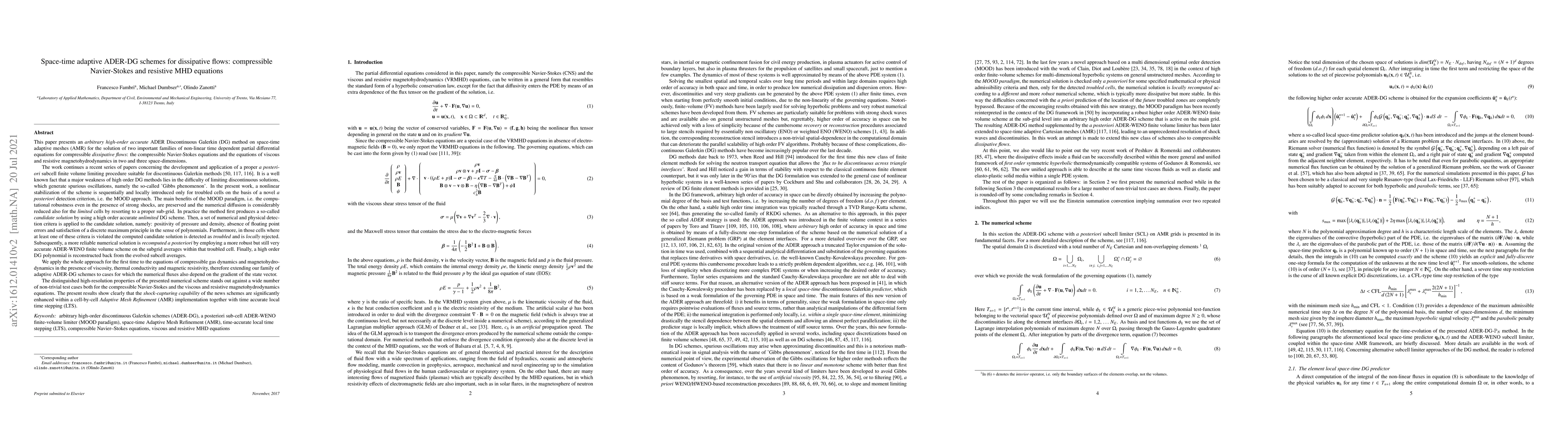 This paper introduces a space-time adaptive ADER-DG method for solving compressible Navier-Stokes and resistive MHD equations, addressing the challenge of limiting discontinuous solutions to avoid spurious oscillations. The method enhances shock-capturing capabilities and reduces numerical diffusion, even in the presence of floating point errors.