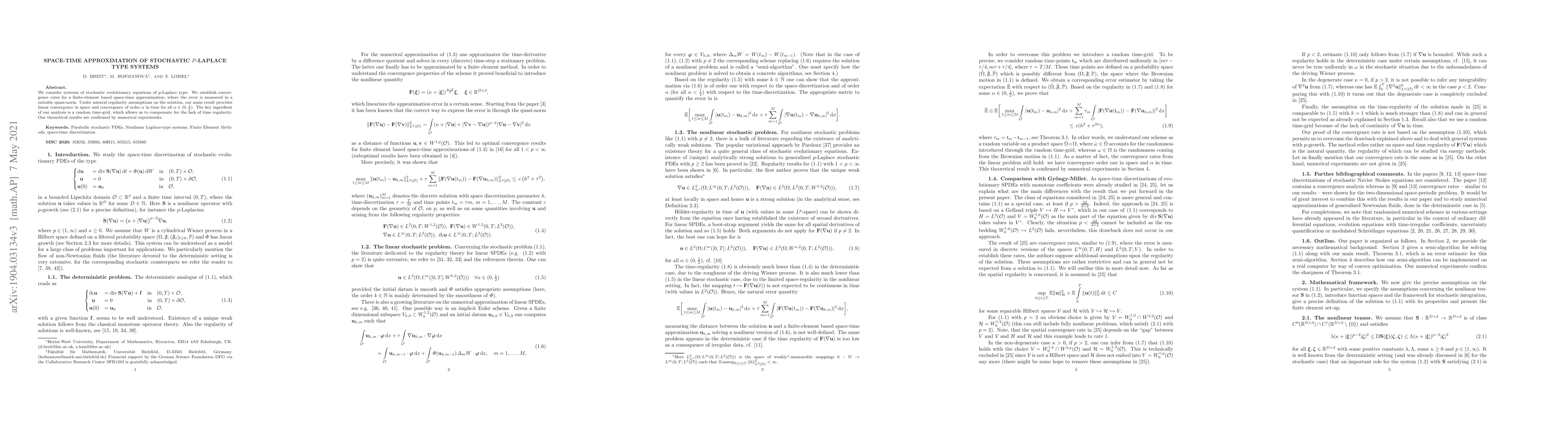 We consider systems of stochastic evolutionary equations of the $p$-Laplace type. We establish convergence rates for a finite-element based space-time approximation, where the error is measured in a suitable quasi-norm. Under natural regularity assumptions on the solution, our main result provides linear convergence in space and convergence of order $\alpha$ in time for all $\alpha\in(0,\frac{1}{2})$. The key ingredient of our analysis is a random time-grid, which allows us to compensate for the lack of time regularity. Our theoretical results are confirmed by numerical experiments.