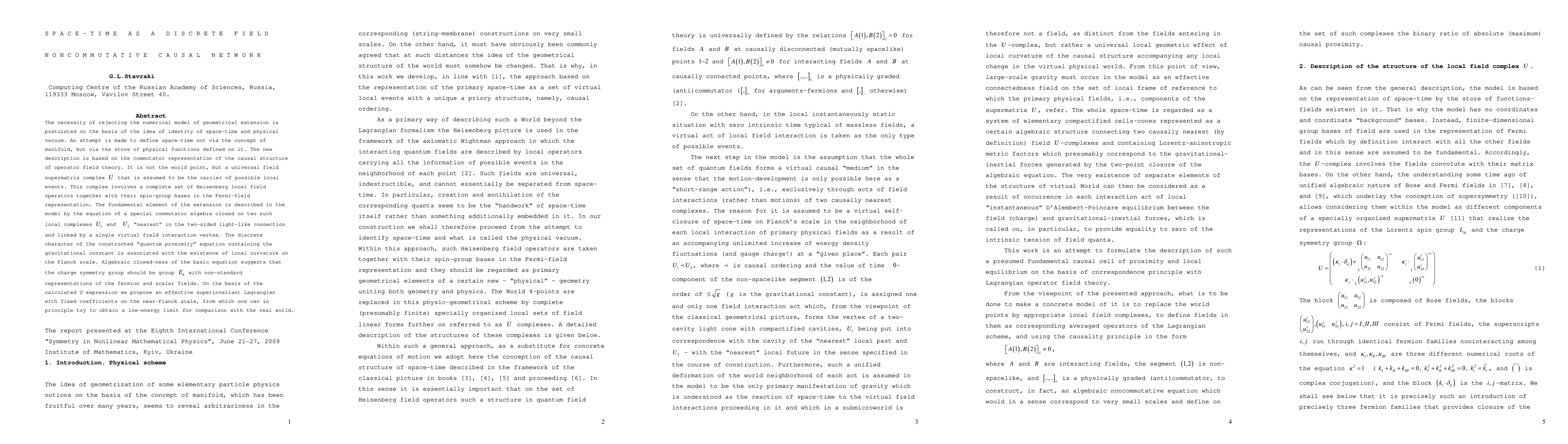 The necessity of rejecting the numerical model of geometrical extension is postulated on the basis of the idea of identity of space-time and physical vacuum. An attempt is made to define space-time not via the concept of manifold, but via the store of physical functions defined on it. The new description is based on the commutator representation of the causal structure of operator field theory. It is not the world point, but a universal field supermatrix complex U that is assumed to be the carrier of possible local events. This complex involves a complete set of Heisenberg local field operators together with their spin-group bases in the Fermi-field representation. The fundamental element of the extension is described in the model by the equation of a special commutator algebra closed on two such local complexes U_1 and U_2 "nearest" in the two-sided light-like connection and linked by a single virtual field interaction vertex. The discrete character of the constructed "quantum proximity" equation containing the gravitational constant is associated with the existence of local curvature on the Planck scale. Algebraic closed-ness of the basic equation suggests that the charge symmetry group should be group E_6 with non-standard representations of the fermion and scalar fields. On the basis of the calculated U expression we propose an effective superinvariant Lagrangian with fixed coefficients on the near-Planck scale, from which one can in principle try to obtain a low-energy limit for comparison with the real world.