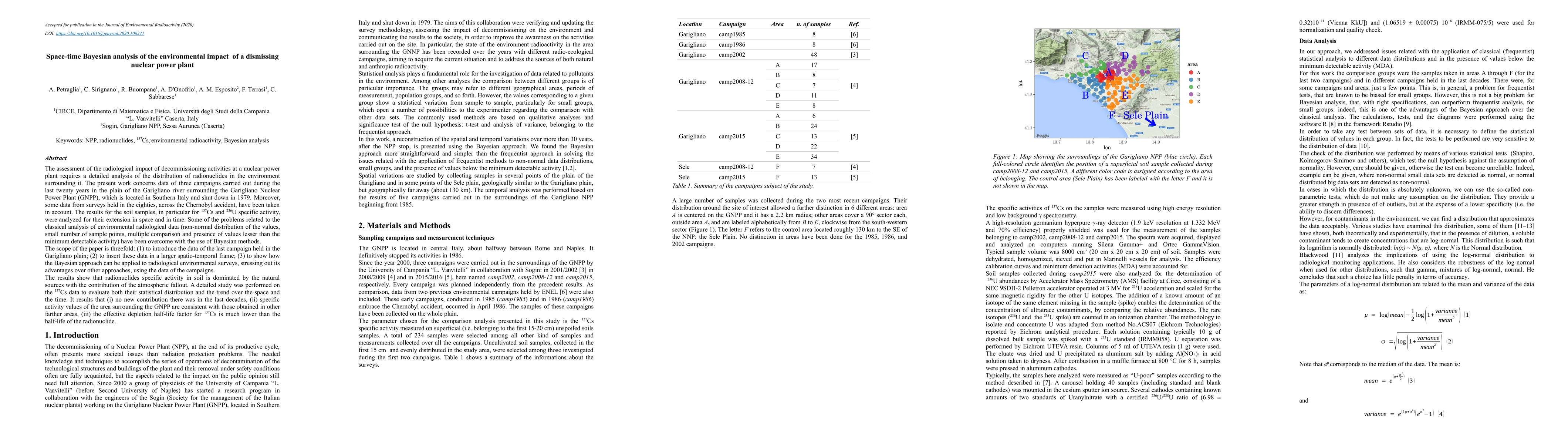 The present work concerns data of three campaigns carried out during the last twenty years in the plain of the Garigliano river surrounding the Garigliano Nuclear Power Plant (GNPP), which is located in Southern Italy and shut down in 1979. Moreover, some data from surveys held in the eighties, across the Chernobyl accident, have been taken in account. The results for the soil samples, in particular for 137Cs and 236U specific activity, were analyzed for their extension in space and in time. Some of the problems related to the classical analysis of environmental radiological data (non-normal distribution of the values, small number of sample points, multiple comparison and presence of values lesser than the minimum detectable activity) have been overcome with the use of Bayesian methods. The scope of the paper is threefold: (1) to introduce the data of the last campaign held in the Garigliano plain; (2) to insert these data in a larger spatio-temporal frame; (3) to show how the Bayesian approach can be applied to radiological environmental surveys, stressing out its advantages over other approaches, using the data of the campaigns. It results that (i) no new contribution there was in the last decades, (ii) specific activity values of the area surrounding the GNPP are consistent with those obtained in other farther areas, (iii) the effective depletion half-life factor for 137Cs is much lower than the half-life of the radionuclide.