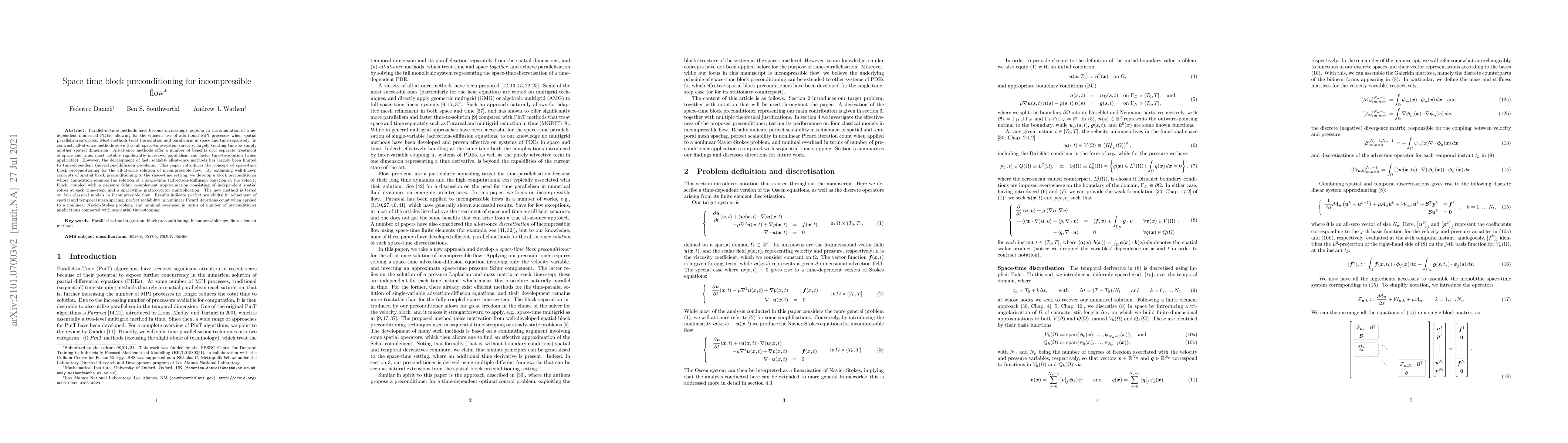 A new method for simulating incompressible flow using space-time block preconditioning achieves perfect scalability in mesh refinement and nonlinear iterations, with minimal overhead compared to sequential time-stepping.
