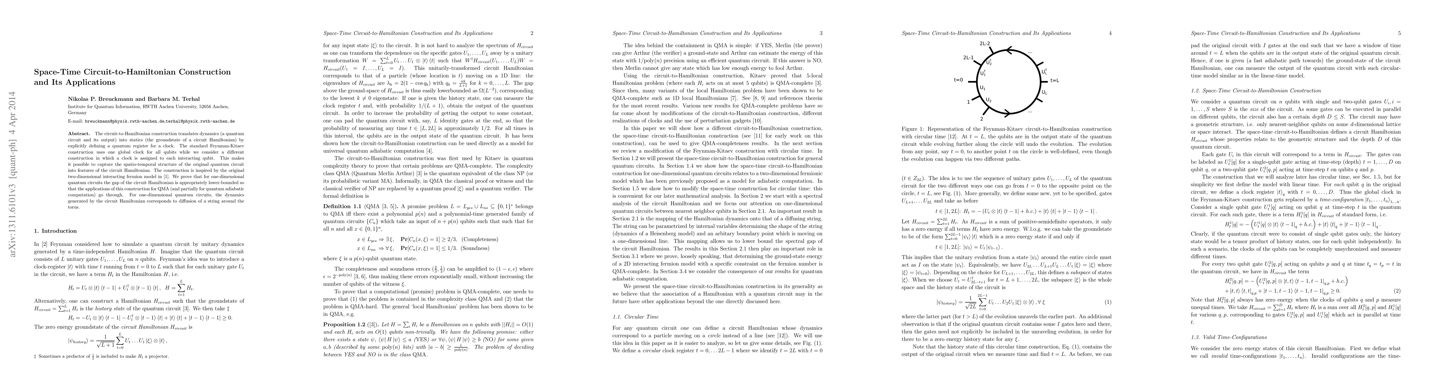 The circuit-to-Hamiltonian construction translates dynamics (a quantum circuit and its output) into statics (the groundstate of a circuit Hamiltonian) by explicitly defining a quantum register for a clock. The standard Feynman-Kitaev construction uses one global clock for all qubits while we consider a different construction in which a clock is assigned to each interacting qubit. This makes it possible to capture the spatio-temporal structure of the original quantum circuit into features of the circuit Hamiltonian. The construction is inspired by the original two-dimensional interacting fermionic model (see http://link.aps.org/doi/10.1103/PhysRevA.63.040302) We prove that for one-dimensional quantum circuits the gap of the circuit Hamiltonian is appropriately lower-bounded, partially using results on mixing times of Markov chains, so that the applications of this construction for QMA (and partially for quantum adiabatic computation) go through. For one-dimensional quantum circuits, the dynamics generated by the circuit Hamiltonian corresponds to diffusion of a string around the torus.