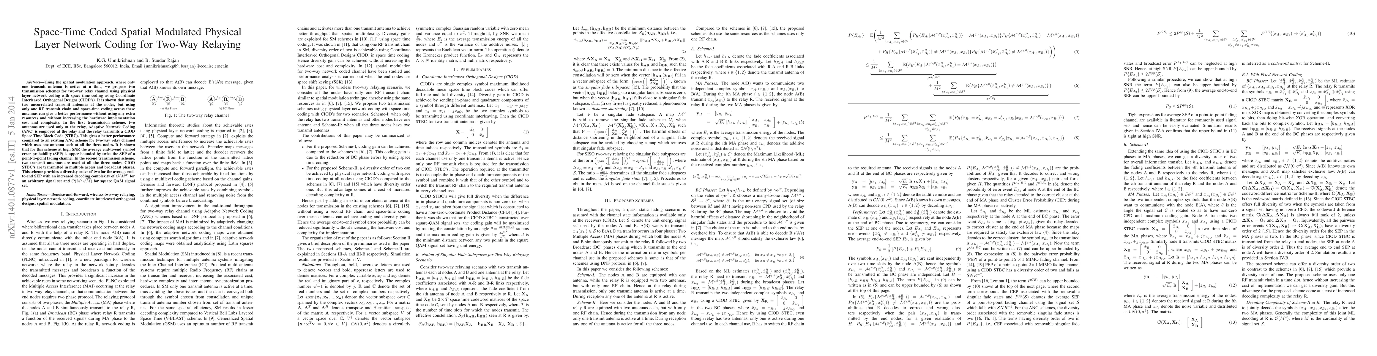 This paper proposes two transmission schemes for two-way relay channels using spatial modulation and physical layer network coding with space-time coding. The schemes utilize two uncorrelated transmit antennas at nodes with a single RF chain, achieving better performance without extra resources or increased complexity.