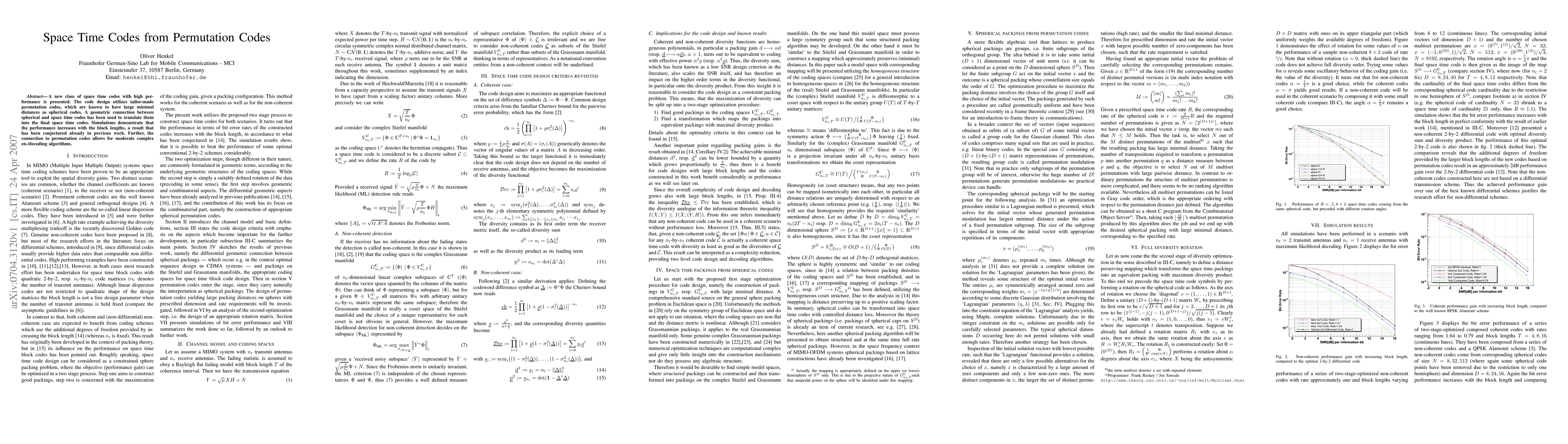 A new class of space time codes with high performance is presented. The code design utilizes tailor-made permutation codes, which are known to have large minimal distances as spherical codes. A geometric connection between spherical and space time codes has been used to translate them into the final space time codes. Simulations demonstrate that the performance increases with the block lengths, a result that has been conjectured already in previous work. Further, the connection to permutation codes allows for moderate complex en-/decoding algorithms.
