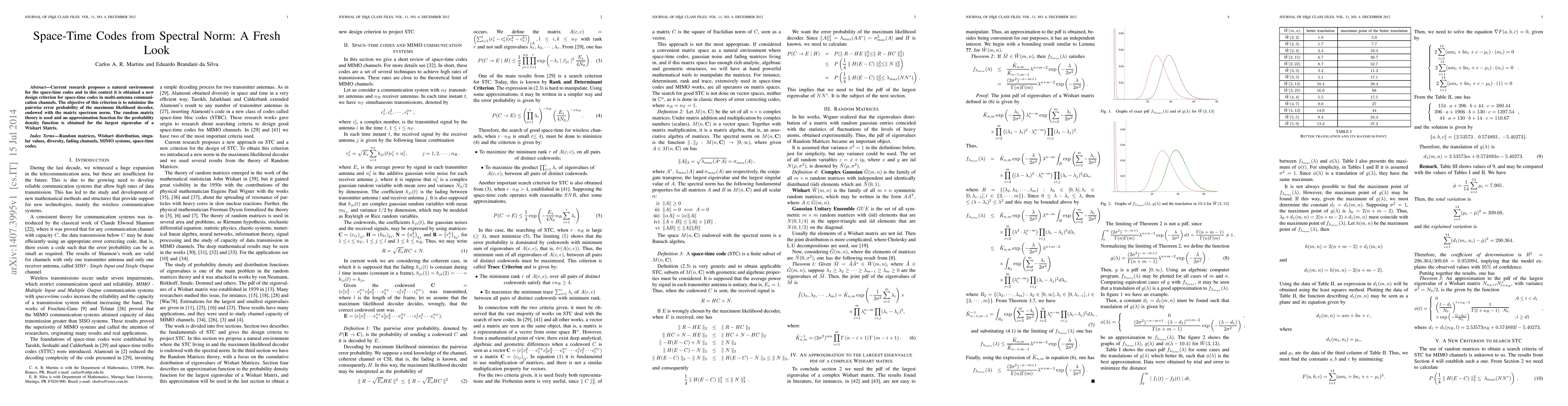 Current research proposes a natural environment for the space-time codes and in this context it is obtained a new design criterion for space-time codes in multi-antenna communication channels. The objective of this criterion is to minimize the pairwise error probability of the maximum likelihood decoder, endowed with the matrix spectrum norm. The random matrix theory is used and an approximation function for the probability density function is obtained for the largest eigenvalue of a Wishart Matrix.