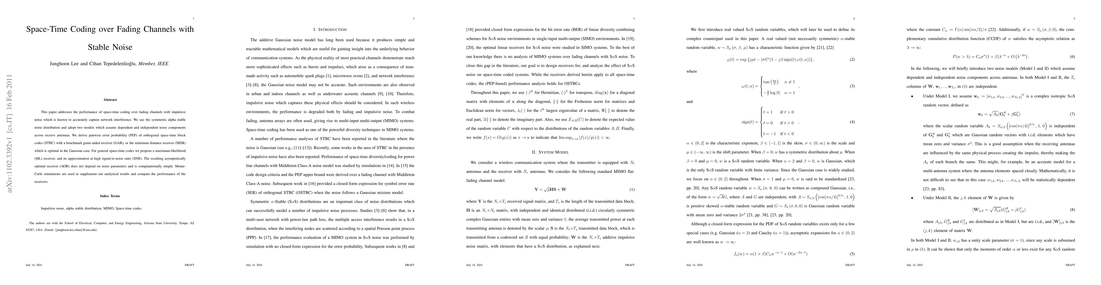 This paper investigates the performance of space-time coding over fading channels with impulsive noise, employing symmetric alpha stable noise distribution. Analytical models and Monte-Carlo simulations are used to derive the pairwise error probability and propose optimal receivers, including an asymptotically optimal receiver that simplifies computations.