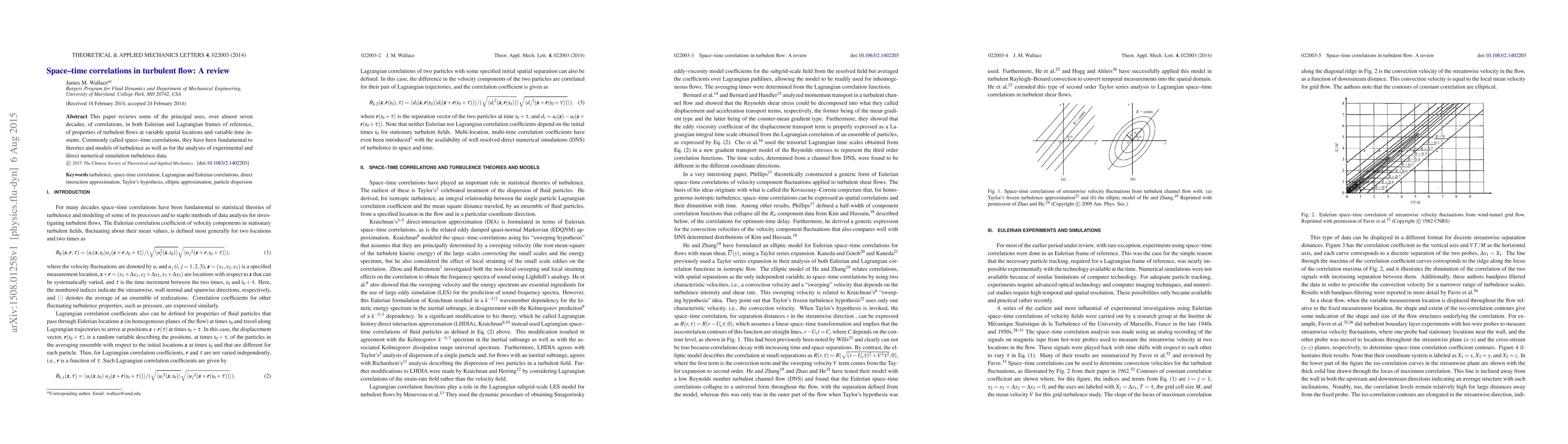 This paper reviews some of the principal uses, over almost seven decades, of correlations, in both Eulerian and Lagrangian frames of reference, of properties of turbulent flows at variable spatial locations and variable time instants. Commonly called space--time correlations, they have been fundamental to theories and models of turbulence as well as for the analyses of experimental and direct numerical simulation turbulence data.