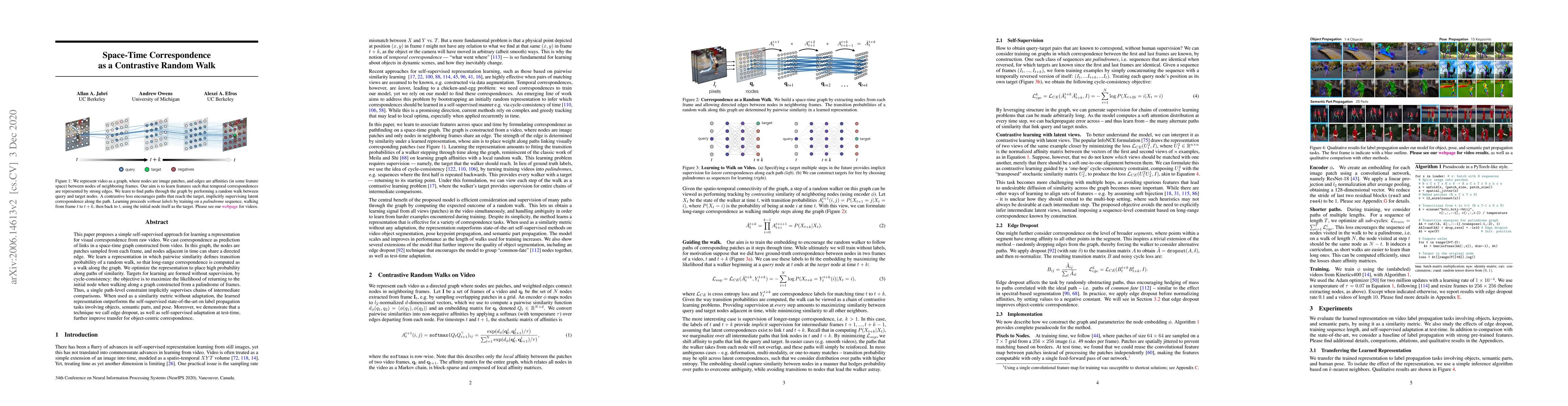 This paper proposes a simple self-supervised approach for learning a representation for visual correspondence from raw video. We cast correspondence as prediction of links in a space-time graph constructed from video. In this graph, the nodes are patches sampled from each frame, and nodes adjacent in time can share a directed edge. We learn a representation in which pairwise similarity defines transition probability of a random walk, so that long-range correspondence is computed as a walk along the graph. We optimize the representation to place high probability along paths of similarity. Targets for learning are formed without supervision, by cycle-consistency: the objective is to maximize the likelihood of returning to the initial node when walking along a graph constructed from a palindrome of frames. Thus, a single path-level constraint implicitly supervises chains of intermediate comparisons. When used as a similarity metric without adaptation, the learned representation outperforms the self-supervised state-of-the-art on label propagation tasks involving objects, semantic parts, and pose. Moreover, we demonstrate that a technique we call edge dropout, as well as self-supervised adaptation at test-time, further improve transfer for object-centric correspondence.