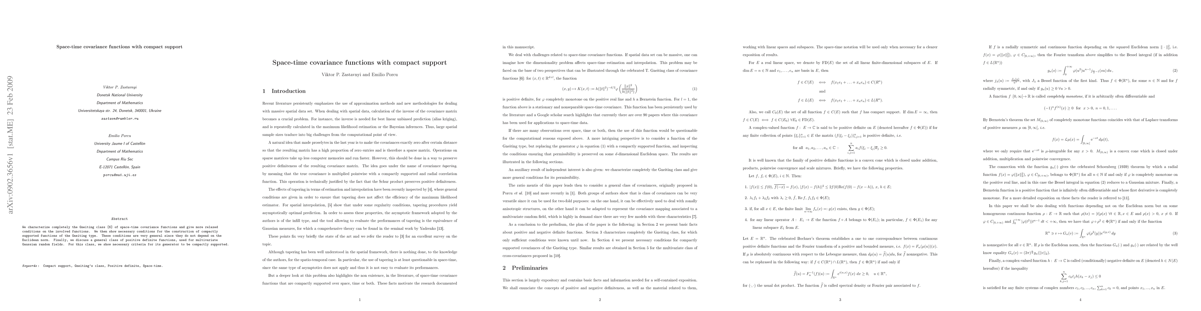 This paper characterizes Gneiting class of space-time covariance functions and provides conditions for constructing compactly supported functions, with implications for Gaussian random fields.