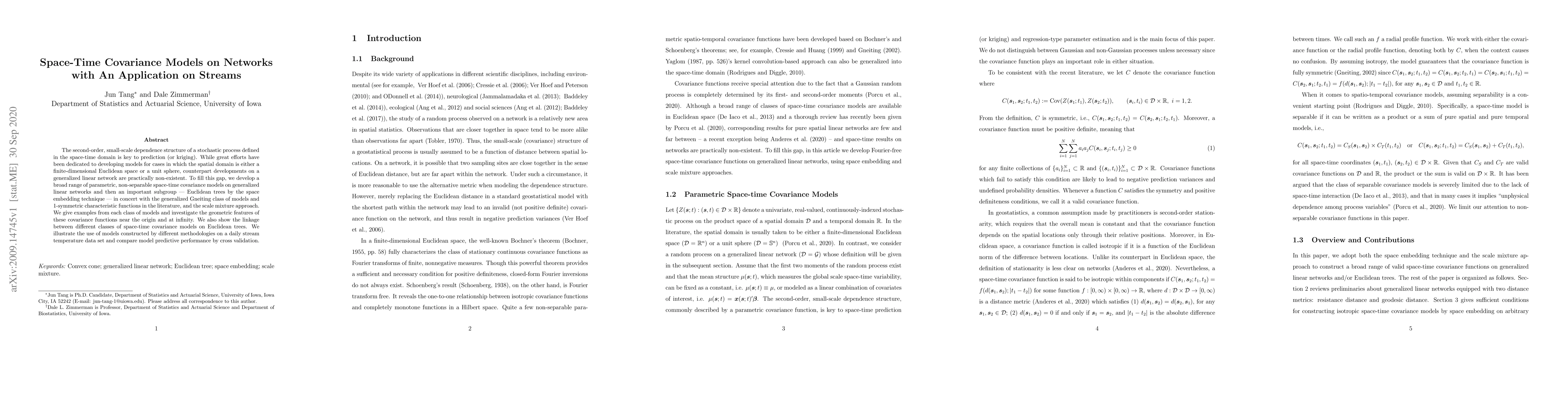 This paper develops parametric, non-separable space-time covariance models for stochastic processes on generalized linear networks, particularly focusing on Euclidean trees. It demonstrates predictive performance on a daily stream temperature dataset and compares models using cross-validation.