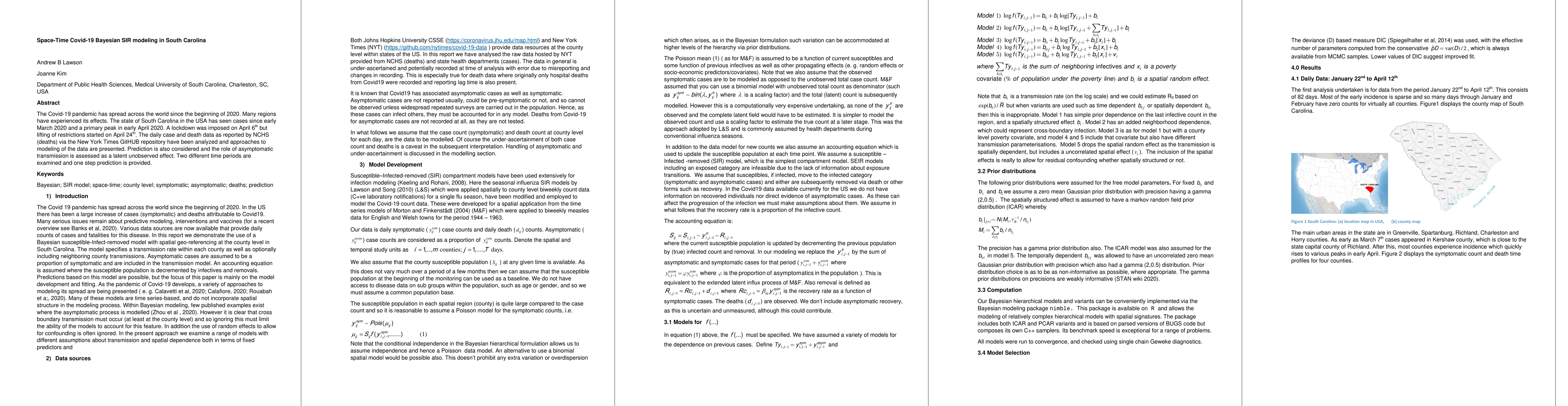 The Covid-19 pandemic has spread across the world since the beginning of 2020. Many regions have experienced its effects. The state of South Carolina in the USA has seen cases since early March 2020 and a primary peak in early April 2020. A lockdown was imposed on April 6th but lifting of restrictions started on April 24th. The daily case and death data as reported by NCHS (deaths) via the New York Times GitHUB repository have been analyzed and approaches to modeling of the data are presented. Prediction is also considered and the role of asymptomatic transmission is assessed as a latent unobserved effect. Two different time periods are examined and one step prediction is provided.