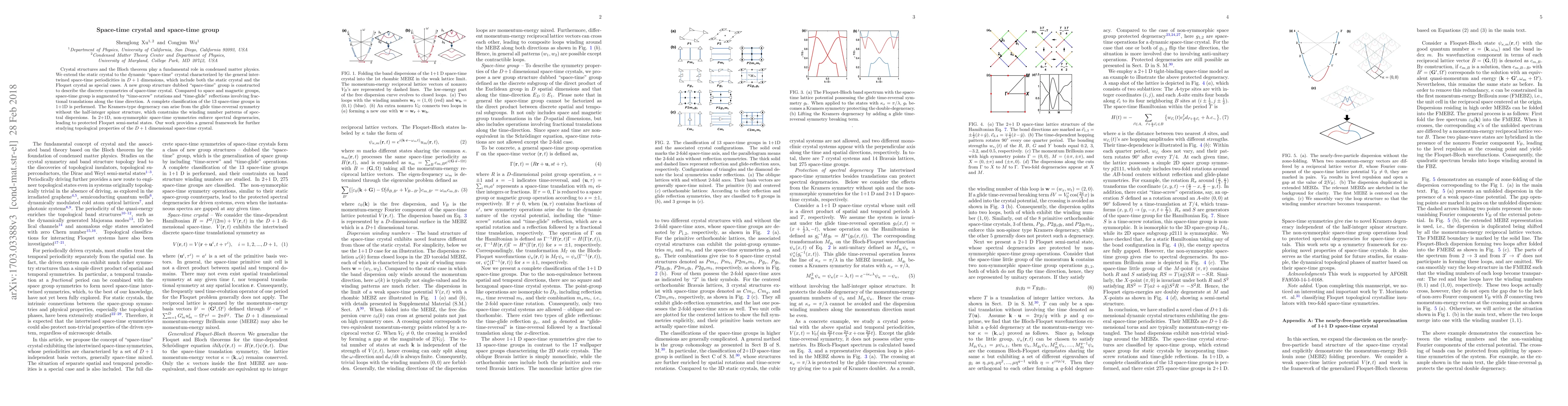 This paper introduces the concept of space-time crystals, extending static crystals to dynamic structures with intertwined space-time periodicities. It constructs a new "space-time group" to describe their symmetries, including unique time-based operations, and classifies these groups in 1+1D and 2+1D dimensions, revealing topological properties and spectral degeneracies.