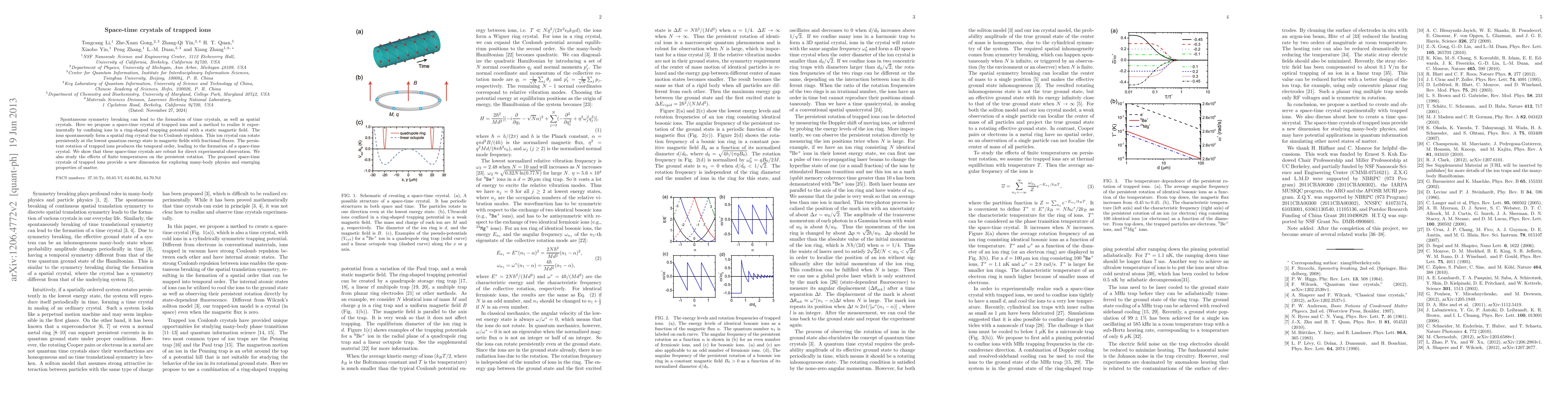 This paper proposes the formation of space-time crystals using trapped ions confined in a ring-shaped potential, where ions rotate persistently at the lowest quantum energy state under fractional magnetic fields, creating a temporal order. The study also examines the robustness of these crystals and their behavior at finite temperatures, highlighting new avenues for many-body physics research.