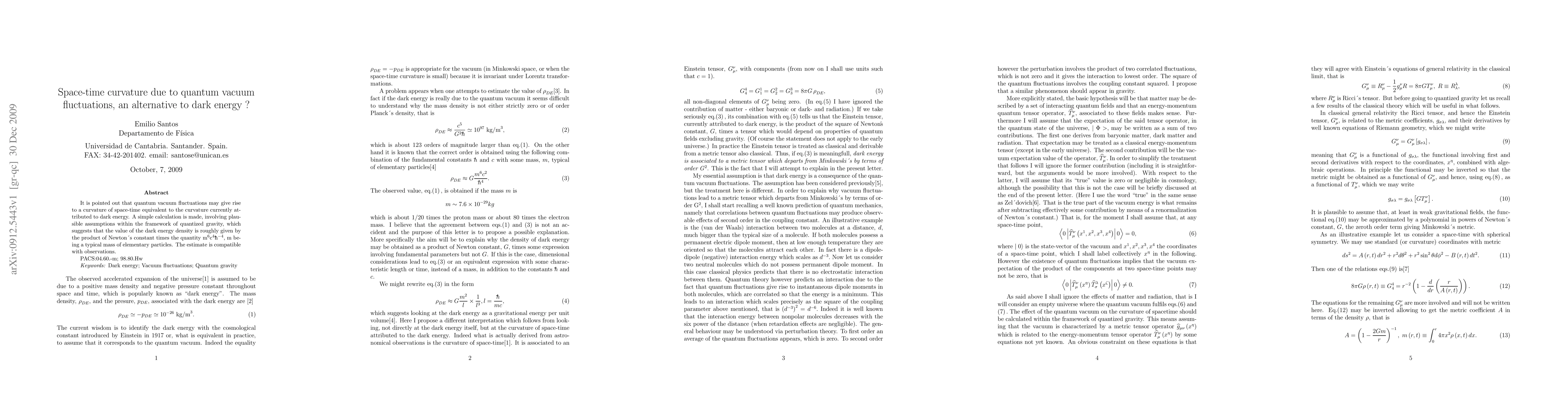 Summary: This paper proposes that quantum vacuum fluctuations could generate space-time curvature comparable to dark energy, suggesting a potential alternative explanation. The calculation estimates the dark energy density using fundamental constants and elementary particle mass, aligning with observational data.