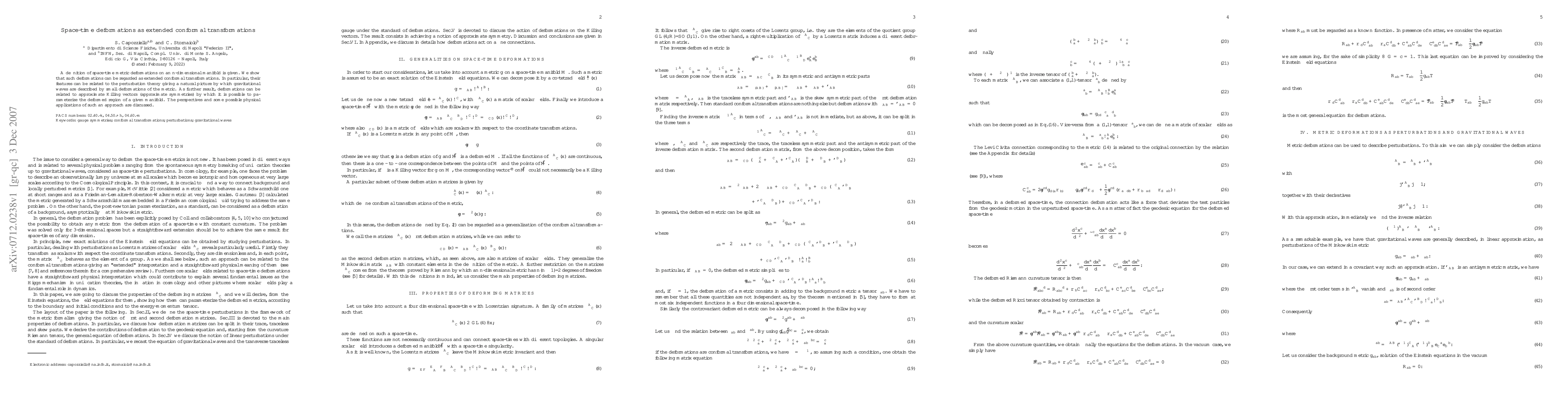A definition of space-time metric deformations on an $n$-dimensional manifold is given. We show that such deformations can be regarded as extended conformal transformations. In particular, their features can be related to the perturbation theory giving a natural picture by which gravitational waves are described by small deformations of the metric. As further result, deformations can be related to approximate Killing vectors (approximate symmetries) by which it is possible to parameterize the deformed region of a given manifold. The perspectives and some possible physical applications of such an approach are discussed.