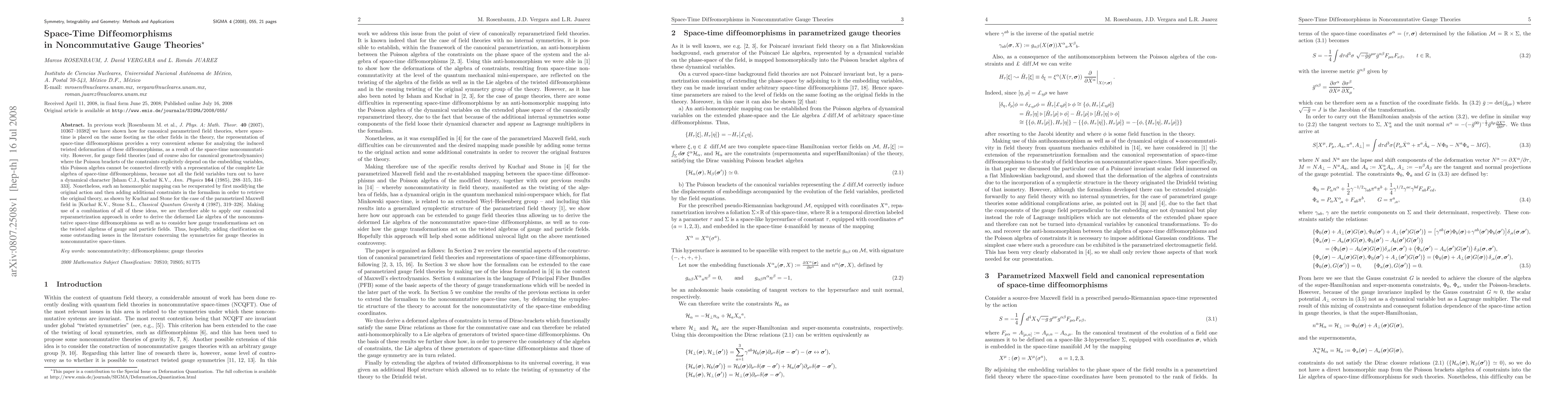 In previous work [Rosenbaum M. et al., J. Phys. A: Math. Theor. 40 (2007), 10367-10382, hep-th/0611160] we have shown how for canonical parametrized field theories, where space-time is placed on the same footing as the other fields in the theory, the representation of space-time diffeomorphisms provides a very convenient scheme for analyzing the induced twisted deformation of these diffeomorphisms, as a result of the space-time noncommutativity. However, for gauge field theories (and of course also for canonical geometrodynamics) where the Poisson brackets of the constraints explicitely depend on the embedding variables, this Poisson algebra cannot be connected directly with a representation of the complete Lie algebra of space-time diffeomorphisms, because not all the field variables turn out to have a dynamical character [Isham C.J., Kuchar K.V., Ann. Physics 164 (1985), 288-315, 316-333]. Nonetheless, such an homomorphic mapping can be recuperated by first modifying the original action and then adding additional constraints in the formalism in order to retrieve the original theory, as shown by Kuchar and Stone for the case of the parametrized Maxwell field in [Kuchar K.V., Stone S.L., Classical Quantum Gravity 4 (1987), 319-328]. Making use of a combination of all of these ideas, we are therefore able to apply our canonical reparametrization approach in order to derive the deformed Lie algebra of the noncommutative space-time diffeomorphisms as well as to consider how gauge transformations act on the twisted algebras of gauge and particle fields. Thus, hopefully, adding clarification on some outstanding issues in the literature concerning the symmetries for gauge theories in noncommutative space-times.