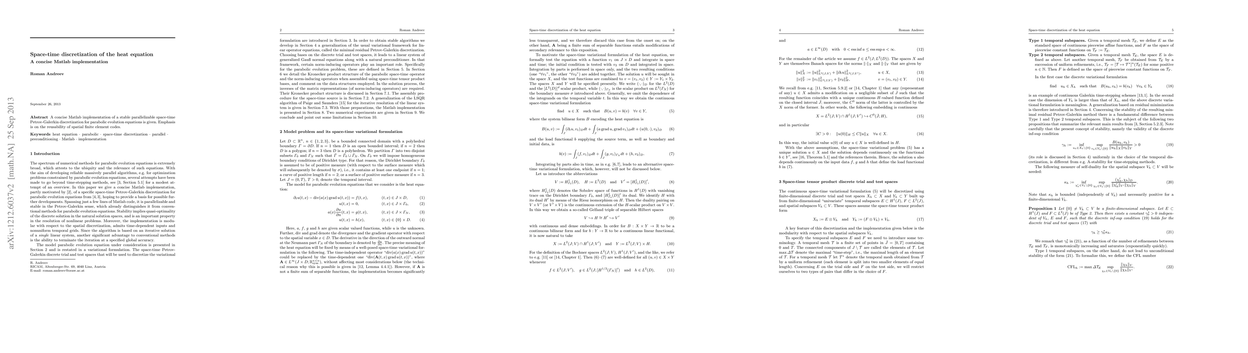 The paper presents a concise Matlab implementation of a stable parallelizable space-time Petrov-Galerkin discretization for parabolic evolution equations, emphasizing reusability of spatial finite element codes.