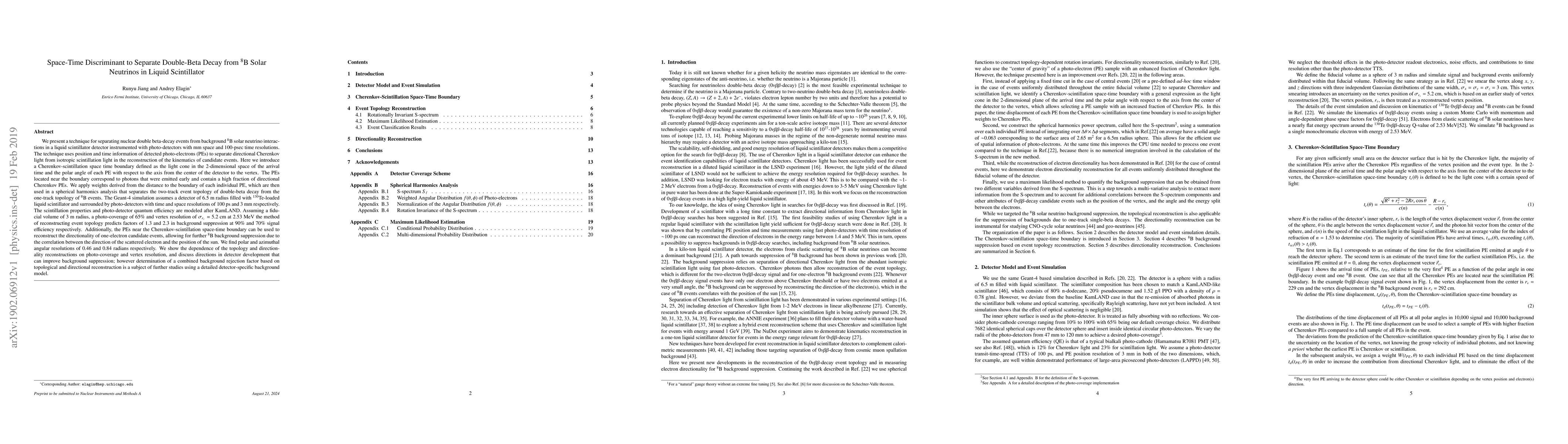 This paper introduces a method to distinguish double beta-decay events from $^8$B solar neutrino interactions in liquid scintillator detectors using a space-time discriminant based on the arrival time and polar angle of photo-electrons. The technique employs a Cherenkov-scintillation boundary to separate directional Cherenkov light from isotropic scintillation light, achieving significant background suppression and directional reconstruction.