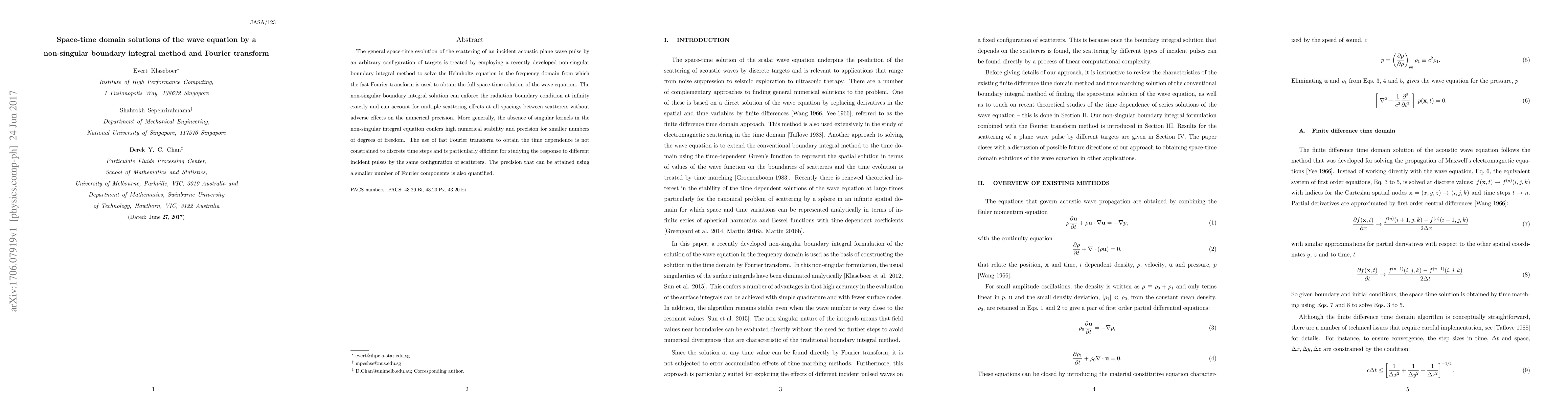 This paper proposes a non-singular boundary integral method to solve the Helmholtz equation in the frequency domain, followed by a fast Fourier transform to obtain the space-time solution of the wave equation. This approach ensures high numerical stability and precision, especially for fewer degrees of freedom, and efficiently handles multiple scattering effects.