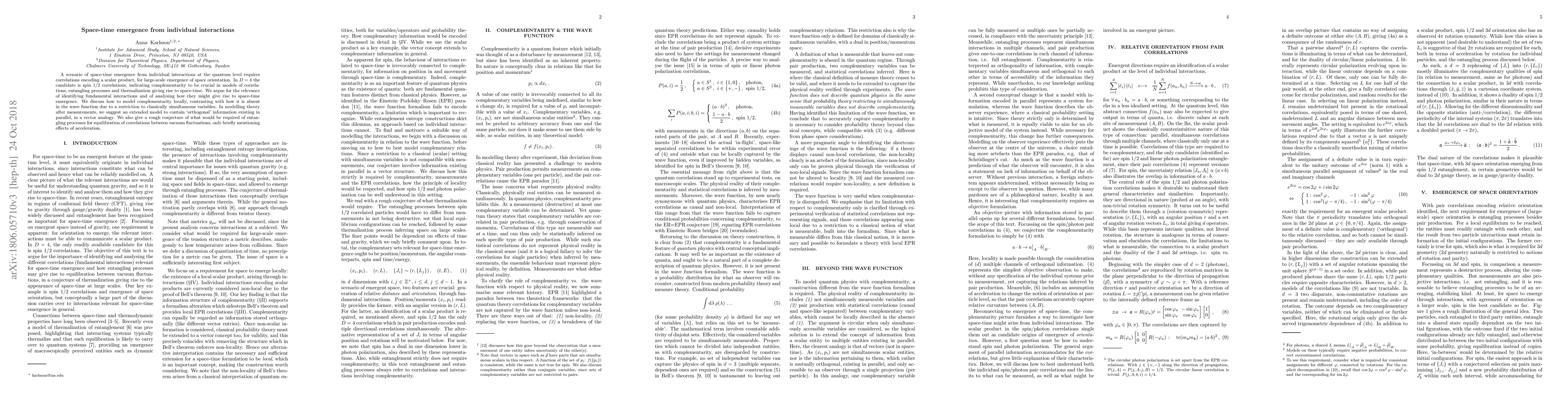 A scenario of space-time emergence from individual interactions at the quantum level requires correlations encoding a scalar product, for large-scale emergence of space orientation. In D=4 the candidate is spin 1/2 correlations, indicating complementarity to be crucial in models of correlations, entangling processes and thermalization giving rise to space-time. We argue for the relevance of identifying fundamental interactions and of analysing how they might give rise to space-time emergence. We discuss how to model complementarity locally, contrasting with how it is absent in the wave function due to a restriction to classically simultaneous variables. In modelling theory after measurements, we suggest an extended model to contain `orthogonal' information existing in parallel, in a vector analogy. We also give a rough conjecture of what would be required of entangling processes for equilibration of correlations between vacuum fluctuations, only briefly mentioning effects of acceleration.