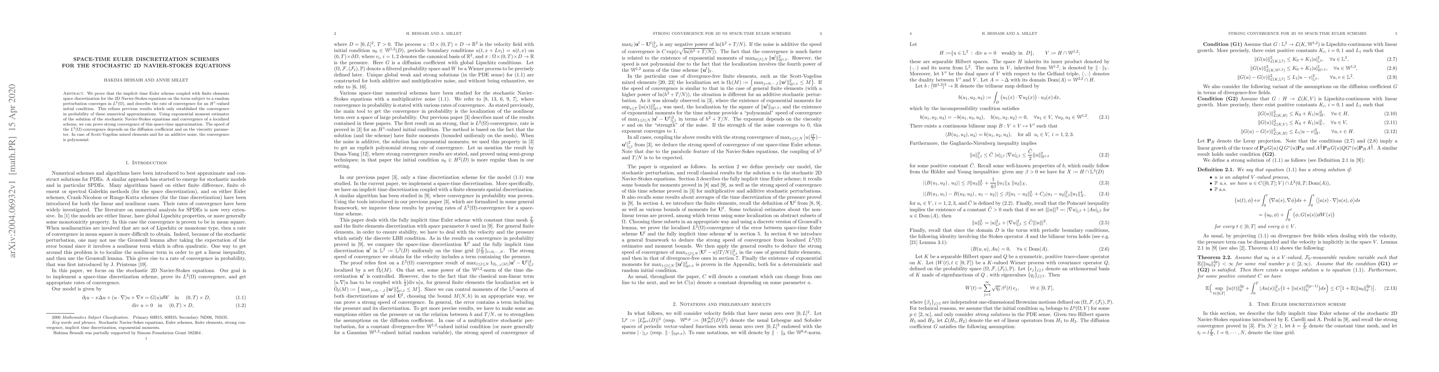 We prove that the implicit time Euler scheme coupled with finite elements space discretization for the 2D Navier-Stokes equations on the torus subject to a random perturbation converges in $L^2(\Omega)$, and describe the rate of convergence for an $H^1$-valued initial condition. This refines previous results which only established the convergence in probability of these numerical approximations. Using exponential moment estimates of the solution of the stochastic Navier-Stokes equations and convergence of a localized scheme, we can prove strong convergence of this space-time approximation. The speed of the $L^2(\Omega)$-convergence depends on the diffusion coefficient and on the viscosity parameter. In case of Scott-Vogelius mixed elements and for an additive noise, the convergence is polynomial.