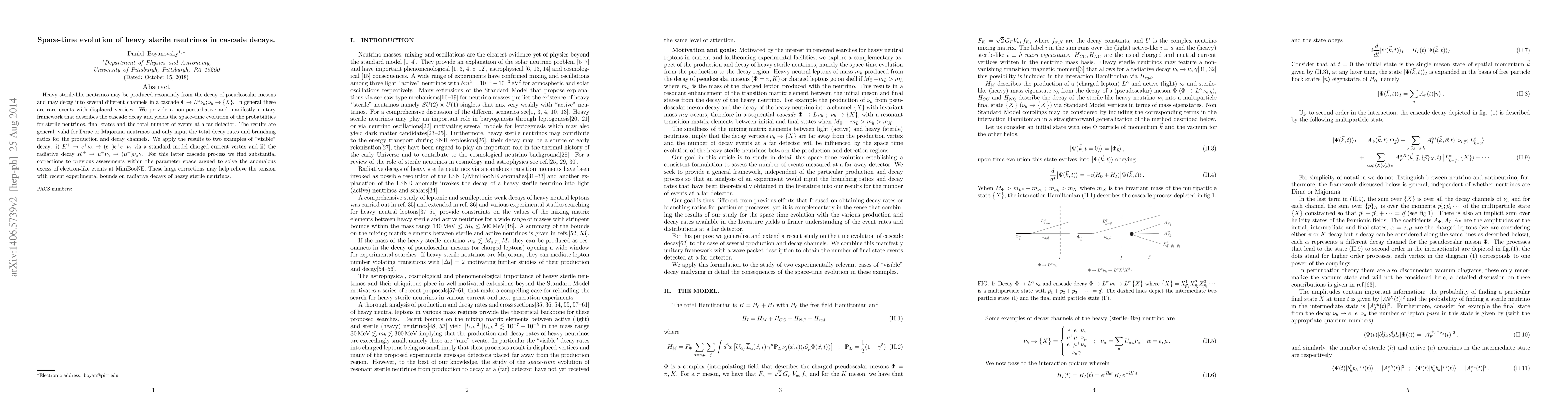 Heavy sterile-like neutrinos may be produced resonantly from the decay of pseudoscalar mesons and may decay into several different channels in a cascade $\Phi \rightarrow L^\alpha \nu_h;\nu_h\rightarrow \{X\}$. In general these are rare events with displaced vertices. We provide a non-perturbative and manifestly unitary framework that describes the cascade decay and yields the space-time evolution of the probabilities for sterile neutrinos, final states and the total number of events at a far detector. The results are general, valid for Dirac or Majorana neutrinos and only input the total decay rates and branching ratios for the production and decay channels. We apply the general results to two examples of "visible" decay: i) $K^+\rightarrow e^+ \nu_h\rightarrow (e^+) e^+ e^- \nu_e$ via a standard model charged current vertex and ii) the radiative decay $K^+\rightarrow \mu^+ \nu_h \rightarrow (\mu^+) \nu_a \gamma$. For this latter cascade process we find substantial corrections to previous assessments within the parameter space argued to solve the anomalous excess of electron-like events at MiniBooNE. These large corrections may help relieve the tension with recent experimental bounds on radiative decays of heavy sterile neutrinos.