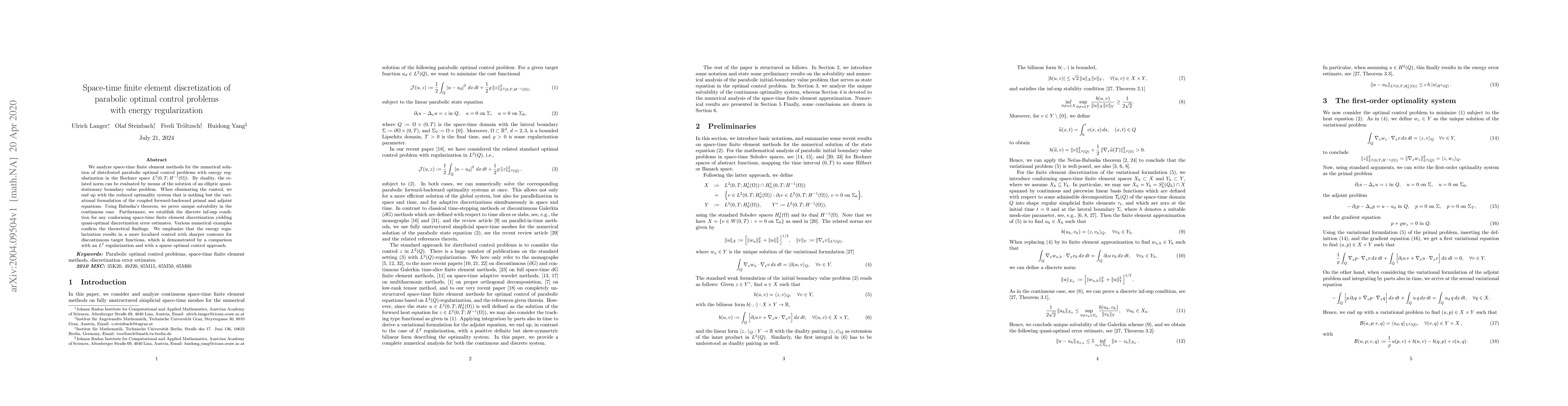 We analyze space-time finite element methods for the numerical solution of distributed parabolic optimal control problems with energy regularization in the Bochner space $L^2(0,T;H^{-1}(\Omega))$. By duality, the related norm can be evaluated by means of the solution of an elliptic quasi-stationary boundary value problem. When eliminating the control, we end up with the reduced optimality system that is nothing but the variational formulation of the coupled forward-backward primal and adjoint equations. Using Babu\v{s}ka's theorem, we prove unique solvability in the continuous case. Furthermore, we establish the discrete inf-sup condition for any conforming space-time finite element discretization yielding quasi-optimal discretization error estimates. Various numerical examples confirm the theoretical findings. We emphasize that the energy regularization results in a more localized control with sharper contours for discontinuous target functions, which is demonstrated by a comparison with an $L^2$ regularization and with a sparse optimal control approach.