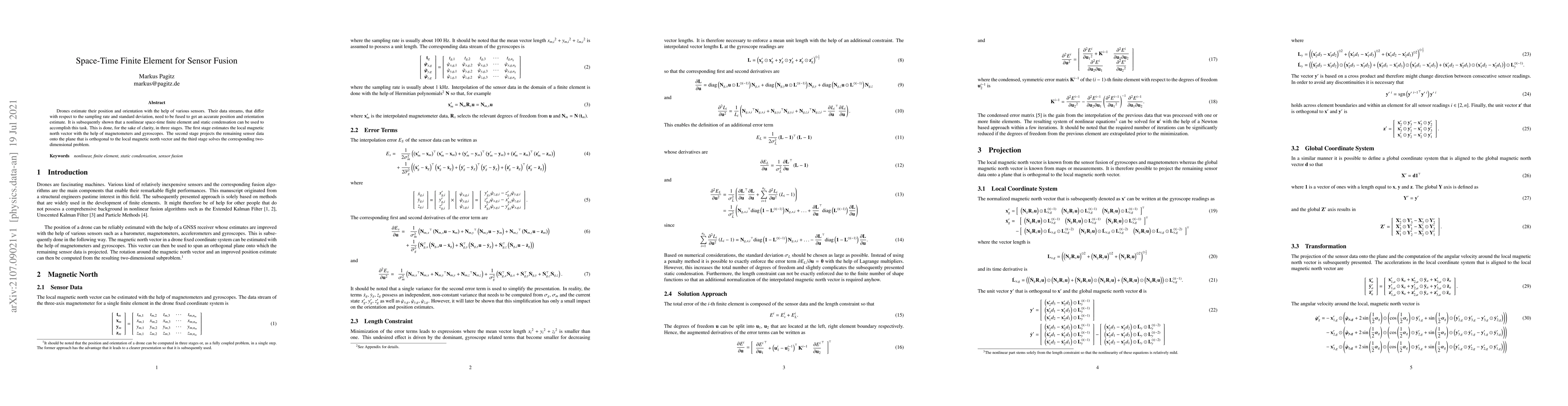 Drones estimate their position and orientation with the help of various sensors. Their data streams, that differ with respect to the sampling rate and standard deviation, need to be fused to get an accurate position and orientation estimate. It is subsequently shown that a nonlinear space-time finite element and static condensation can be used to accomplish this task. This is done, for the sake of clarity, in three stages. The first stage estimates the local magnetic north vector with the help of magnetometers and gyroscopes. The second stage projects the remaining sensor data onto the plane that is orthogonal to the local magnetic north vector and the third stage solves the corresponding two-dimensional problem.
