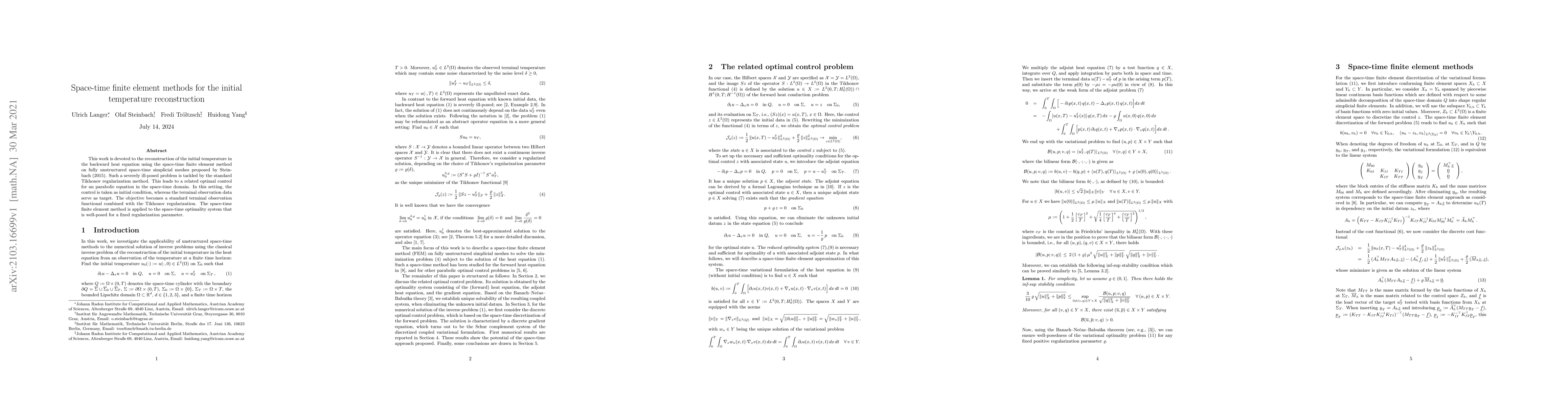 This work is devoted to the reconstruction of the initial temperature in the backward heat equation using the space-time finite element method on fully unstructured space-time simplicial meshes proposed by Steinbach (2015). Such a severely ill-posed problem is tackled by the standard Tikhonov regularization method. This leads to a related optimal control for an parabolic equation in the space-time domain. In this setting, the control is taken as initial condition, whereas the terminal observation data serve as target. The objective becomes a standard terminal observation functional combined with the Tikhonov regularization. The space-time finite element method is applied to the space-time optimality system that is well-posed for a fixed regularization parameter.