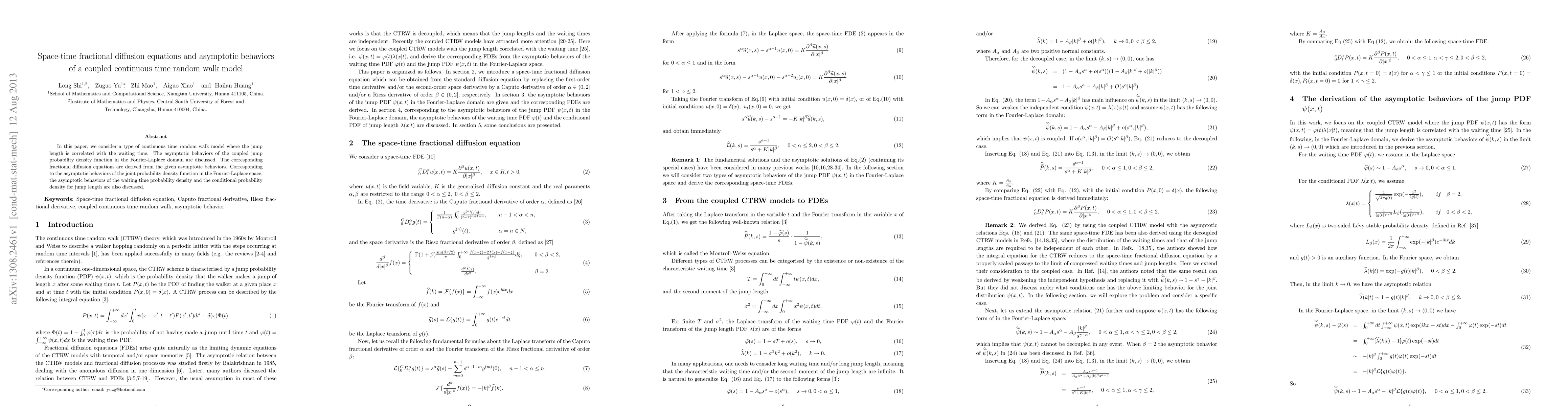 This paper investigates a continuous time random walk model with correlated jump length and waiting time, deriving space-time fractional diffusion equations from the asymptotic behaviors of the coupled jump probability density function in the Fourier-Laplace domain. It also explores the asymptotic behaviors of the waiting time and conditional probability densities for jump length.
