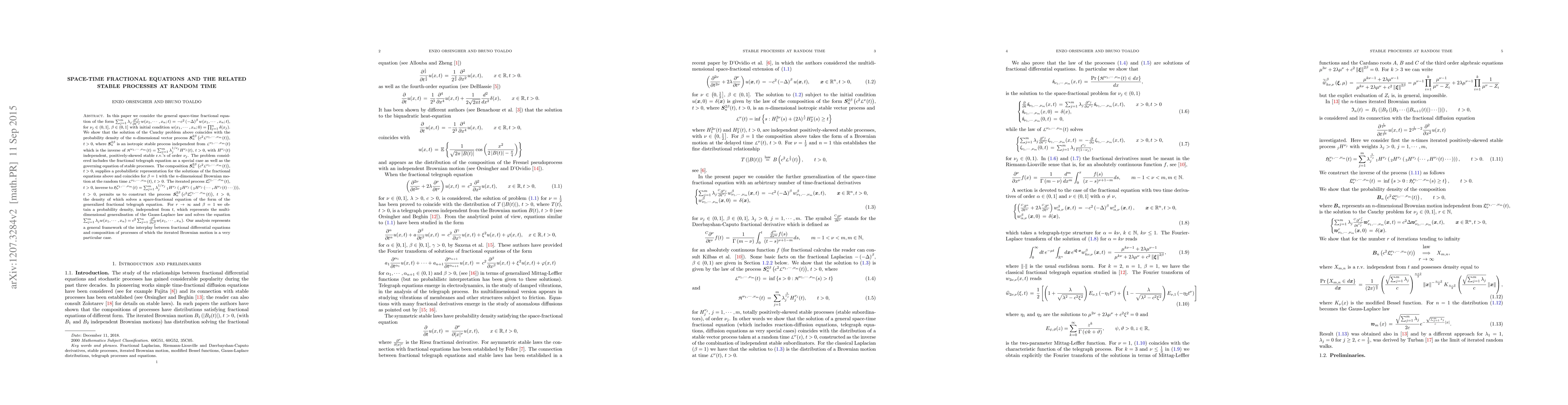 In this paper we consider the general fractional equation \sum_{j=1}^m \lambda_j \frac{\partial^{\nu_j}}{\partial t^{\nu_j}} w(x_1,..., x_n ; t) = -c^2 (-\Delta)^\beta w(x_1,..., x_n ; t), for \nu_j \in (0,1], \beta \in (0,1] with initial condition w(x_1,..., x_n ; 0)= \prod_{j=1}^n \delta (x_j). The solution of the Cauchy problem above coincides with the distribution of the n-dimensional process \bm{S}_n^{2\beta} \mathcal{L} c^2 {L}^{\nu_1,..., \nu_m} (t) \r, t>0, where \bm{S}_n^{2\beta} is an isotropic stable process independent from {L}^{\nu_1,..., \nu_m}(t) which is the inverse of {H}^{\nu_1,..., \nu_m} (t) = \sum_{j=1}^m \lambda_j^{1/\nu_j} H^{\nu_j} (t), t>0, with H^{\nu_j}(t) independent, positively-skewed stable r.v.'s of order \nu_j. The problem considered includes the fractional telegraph equation as a special case as well as the governing equation of stable processes. The composition \bm{S}_n^{2\beta} (c^2 {L}^{\nu_1,..., \nu_m} (t)), t>0, supplies a probabilistic representation for the solutions of the fractional equations above and coincides for \beta = 1 with the n-dimensional Brownian motion at the time {L}^{\nu_1,..., \nu_m} (t), t>0. The iterated process {L}^{\nu_1,..., \nu_m}_r (t), t>0, inverse to {H}^{\nu_1,..., \nu_m}_r (t) =\sum_{j=1}^m \lambda_j^{1/\nu_j} _1H^{\nu_j} (_{2}H^{\nu_j} (_3H^{\nu_j} (... _{r}H^{\nu_j} (t)...))), t>0, permits us to construct the process \bm{S}_n^{2\beta} (c^2 {L}^{\nu_1,..., \nu_m}_r (t)), t>0, the distribution of which solves a space-fractional generalized telegraph equation. For r \to \infty and \beta = 1 we obtain a distribution which represents the n-dimensional generalisation of the Gauss-Laplace law and solves the equation \sum_{j=1}^m \lambda_j w(x_1,..., x_n) = c^2 \sum_{j=1}^n \frac{\partial^2}{\partial x_j^2} w(x_1,..., x_n).