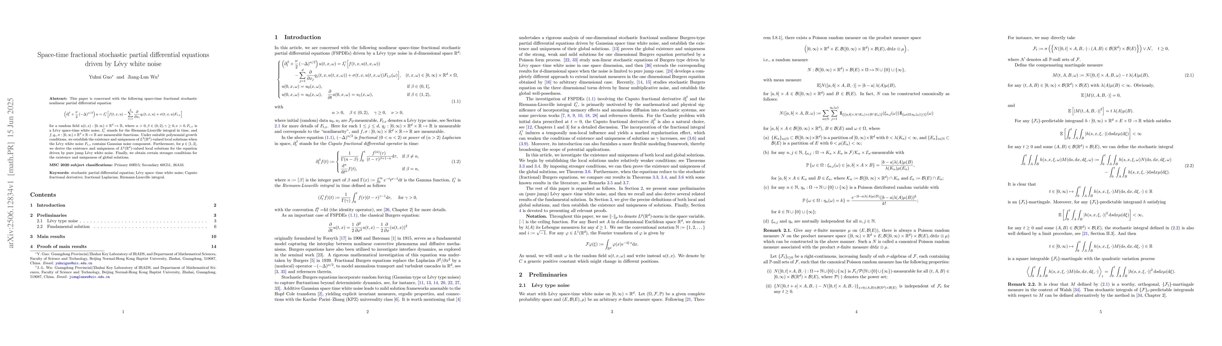 This paper is concerned with the following space-time fractional stochastic nonlinear partial differential equation \begin{equation*} \left(\partial_t^{\beta}+\frac{\nu}{2}\left(-\Delta\right)^{\alpha / 2}\right) u=I_{t}^{\gamma}\Big[ f(t,x,u)-\sum_{i=1}^{d} \frac{\partial}{\partial x_i} q_i(t,x,u)+ \sigma(t,x,u) F_{t,x}\Big] \end{equation*} for a random field $u(t,x):[0,\infty)\times\mathbb{R}^d \mapsto\mathbb{R}$, where $\alpha>0, \beta\in(0,2), \gamma\ge0, \nu>0, F_{t,x}$ is a L\'evy space-time white noise, $I_{t}^\gamma$ stands for the Riemann-Liouville integral in time, and $f,q_i,\sigma:[0,\infty)\times\mathbb{R}^d\times\mathbb{R} \mapsto\mathbb{R}$ are measurable functions. Under suitable polynomial growth conditions, we establish the existence and uniqueness of $L^2(\mathbb{R}^d)$-valued local solutions when the L\'evy white noise $F_{t,x}$ contains Gaussian noise component. Furthermore, for $p\in[1,2]$, we derive the existence and uniqueness of $L^p(\mathbb{R}^d)$-valued local solutions for the equation driven by pure jump L\'evy white noise. Finally, we obtain certain stronger conditions for the existence and uniqueness of global solutions.