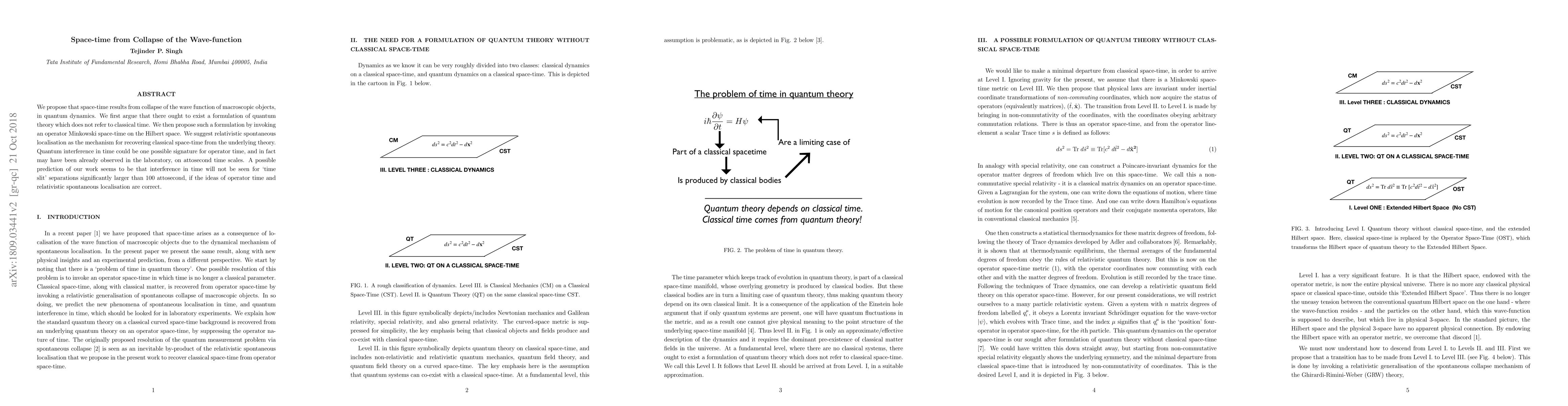 We propose that space-time results from collapse of the wave function of macroscopic objects, in quantum dynamics. We first argue that there ought to exist a formulation of quantum theory which does not refer to classical time. We then propose such a formulation by invoking an operator Minkowski space-time on the Hilbert space. We suggest relativistic spontaneous localisation as the mechanism for recovering classical space-time from the underlying theory. Quantum interference in time could be one possible signature for operator time, and in fact may have been already observed in the laboratory, on attosecond time scales. A possible prediction of our work seems to be that interference in time will not be seen for `time slit' separations significantly larger than 100 attosecond, if the ideas of operator time and relativistic spontaneous localisation are correct.