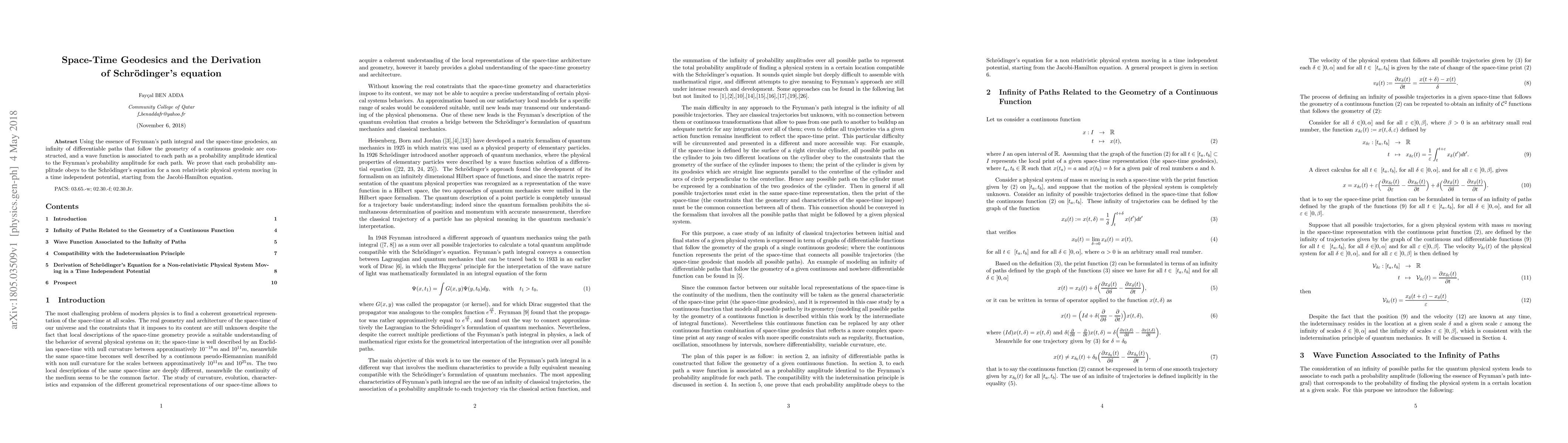 Using the essence of Feynman's path integral and the space-time geodesics, an infinity of differentiable paths that follow the geometry of a continuous geodesic are constructed, and a wave function is associated to each path as a probability amplitude identical to the Feynman's probability amplitude for each path. We prove that each probability amplitude obeys to the Schr\"odinger's equation for a non relativistic physical system moving in a time independent potential, starting from the Jacobi-Hamilton equation.