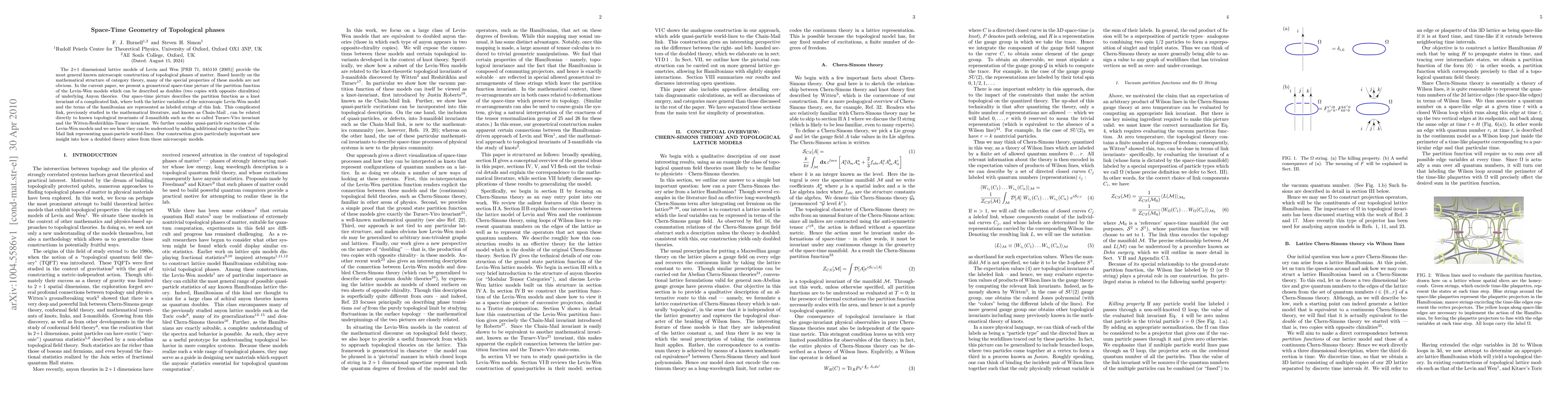 The 2+1 dimensional lattice models of Levin and Wen [PRB 71, 045110 (2005)] provide the most general known microscopic construction of topological phases of matter. Based heavily on the mathematical structure of category theory, many of the special properties of these models are not obvious. In the current paper, we present a geometrical space-time picture of the partition function of the Levin-Wen models which can be described as doubles (two copies with opposite chiralities) of underlying Anyon theories. Our space-time picture describes the partition function as a knot invariant of a complicated link, where both the lattice variables of the microscopic Levin-Wen model and the terms of the hamiltonian are represented as labeled strings of this link. This complicated link, previously studied in the mathematical literature, and known as Chain-Mail, can be related directly to known topological invariants of 3-manifolds such as the so called Turaev-Viro invariant and the Witten-Reshitikhin-Turaev invariant. We further consider quasi-particle excitations of the Levin-Wen models and we see how they can be understood by adding additional strings to the Chain-Mail link representing quasi-particle world-lines. Our construction gives particularly important new insight into how a doubled theory arises from these microscopic models.