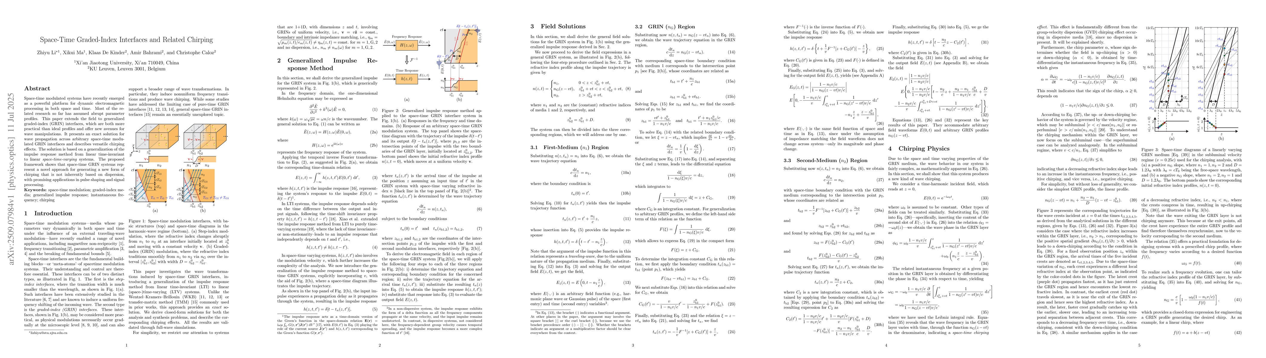 Space-time modulated systems have recently emerged as a powerful platform for dynamic electromagnetic processing in both space and time. Most of the related research so far has assumed abrupt parameter profiles. This paper extends the field to generalized graded-index (GRIN) interfaces, which are both more practical than ideal profiles and offer new avenues for wave manipulations. It presents an exact solution for wave propagation across arbitrary space-time modulated GRIN interfaces and describes versatile chirping effects. The solution is based on a generalization of the impulse response method from linear time-invariant to linear space-time-varying systems. The proposed framework shows that space-time GRIN systems represent a novel approach for generating a new form of chirping that is not inherently based on dispersion, with promising applications in pulse shaping and signal processing.