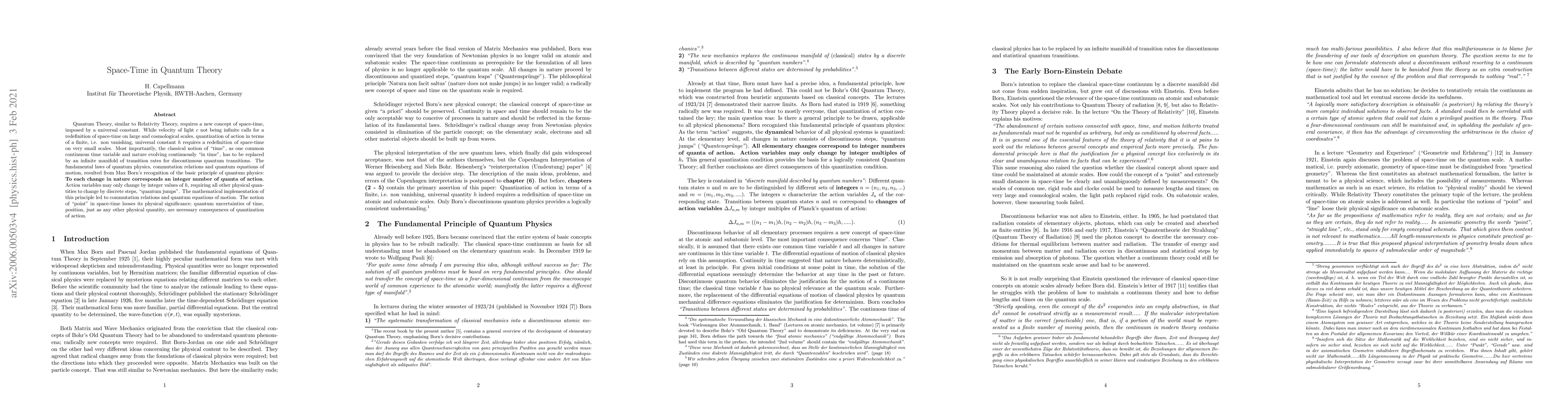 Quantum Theory, similar to Relativity Theory, requires a new concept of space-time, imposed by a universal constant. While velocity of light $c$ not being infinite calls for a redefinition of space-time on large and cosmological scales, quantization of action in terms of a finite, i.e. non vanishing, universal constant $h$ requires a redefinition of space-time on very small scales. Most importantly, the classical notion of "time", as one common continuous time variable and nature evolving continuously "in time", has to be replaced by an infinite manifold of transition rates for discontinuous quantum transitions. The fundamental laws of quantum physics, commutation relations and quantum equations of motion, resulted from Max Born's recognition of the basic principle of quantum physics: {\bf To each change in nature corresponds an integer number of quanta of action}. Action variables may only change by integer values of $h$, requiring all other physical quantities to change by discrete steps, "quantum jumps". The mathematical implementation of this principle led to commutation relations and quantum equations of motion. The notion of "point" in space-time looses its physical significance; quantum uncertainties of time, position, just as any other physical quantity, are necessary consequences of quantization of action.