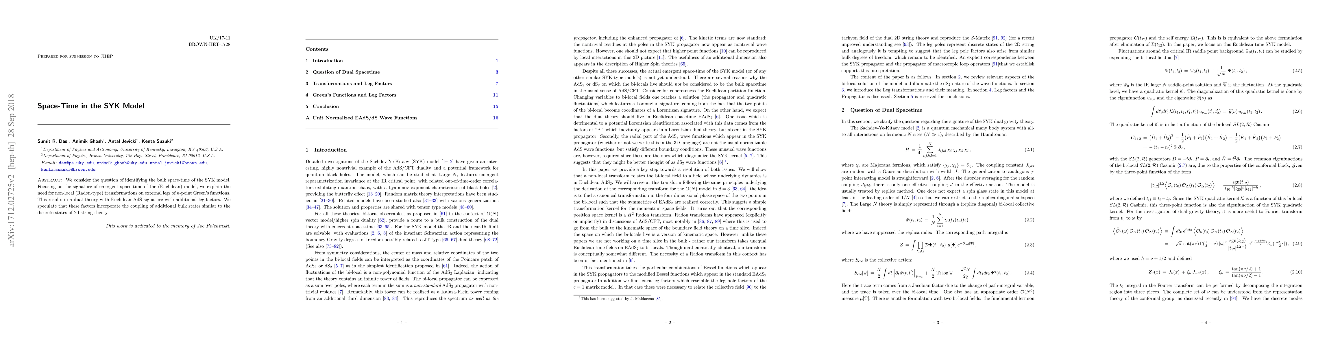 This paper explores the emergent space-time in the SYK model, proposing non-local transformations that lead to a dual theory with a Euclidean AdS signature. It suggests that additional leg-factors may represent the coupling of extra bulk states akin to those found in 2d string theory.