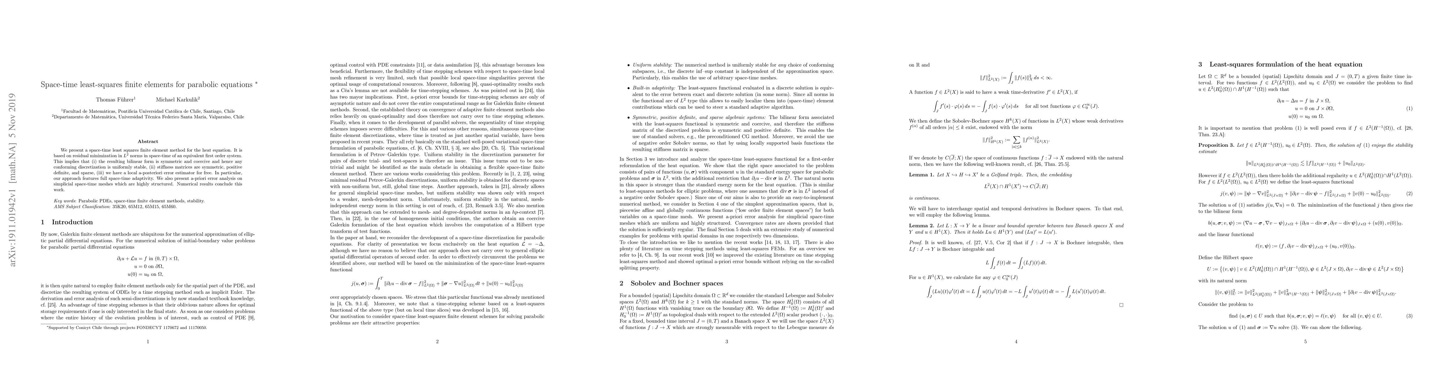 This paper introduces a space-time least squares finite element method for parabolic equations, ensuring symmetric, coercive bilinear forms and sparse, positive definite stiffness matrices. It also provides a local a-posteriori error estimator and demonstrates full space-time adaptivity, supported by a-priori error analysis and numerical results.