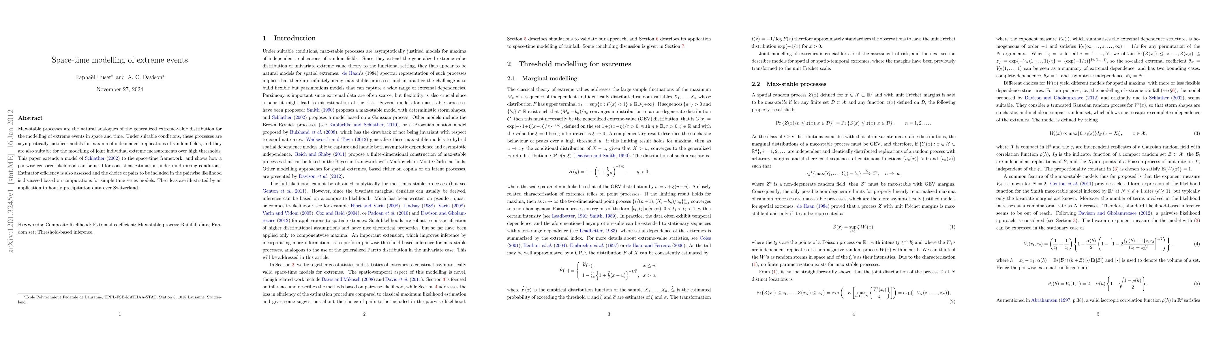 This paper extends a space-time model for max-stable processes to analyze extreme events, employing a pairwise censored likelihood for consistent estimation. The method is demonstrated through an application to hourly precipitation data in Switzerland, assessing estimator efficiency and optimal pair selection.