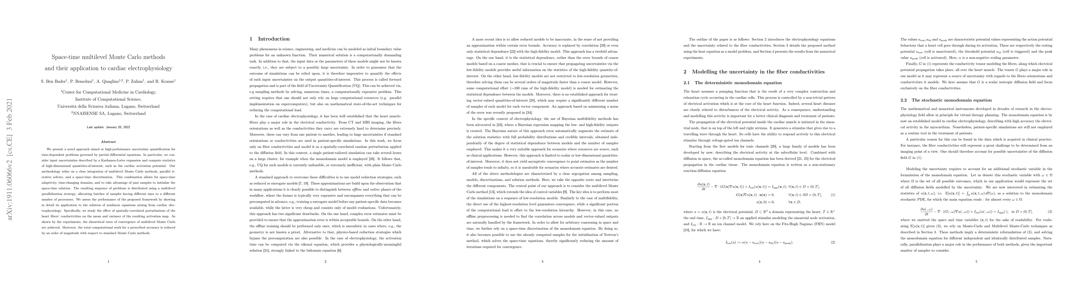 This paper introduces a novel space-time multilevel Monte Carlo method for high-performance uncertainty quantification in time-dependent PDEs, particularly applied to cardiac electrophysiology. The method significantly reduces computational work by an order of magnitude compared to standard Monte Carlo, achieving theoretical convergence rates.