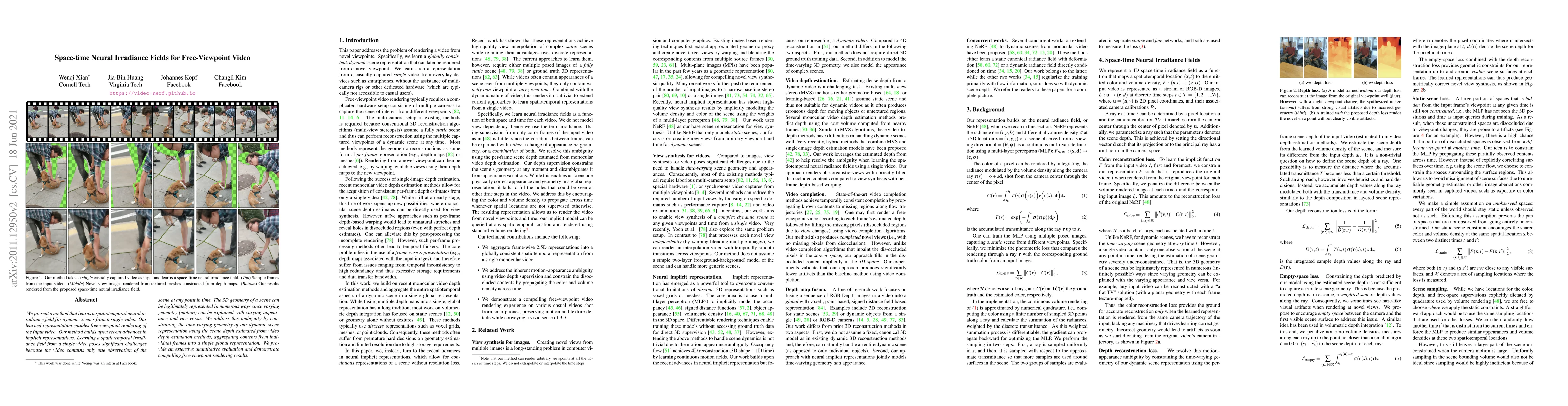 This paper introduces a novel method to learn spatiotemporal neural irradiance fields from a single video, enabling free-viewpoint rendering. It addresses the challenge of scene ambiguity by using estimated scene depth to constrain the dynamic scene representation, providing quantitative evaluation and impressive rendering results.