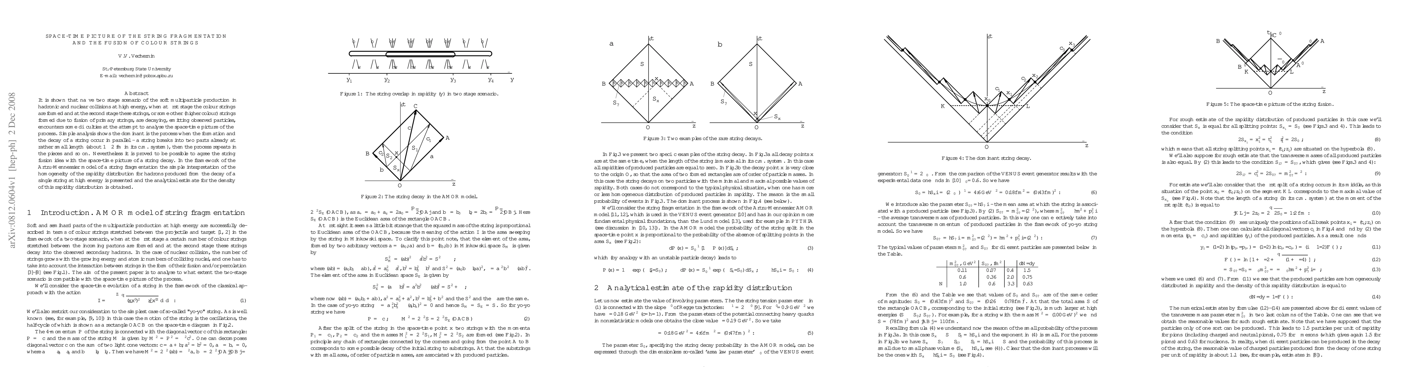 It is shown that naive two stage scenario of the soft multiparticle production in hadronic and nuclear collisions at high energy, when at first stage the colour strings are formed and at the second stage these strings, or some other (higher colour) strings formed due to fusion of primary strings, are decaying, emitting observed particles, encounters some difficulties at the attempt to analyse the space-time picture of the process. Simple analysis shows the dominant is the process when the formation and the decay of a string occur in parallel - a string breaks into two parts already at rather small length (about 1-2 fm in its c.m. system), then the process repeats in the pieces and so on. Nevertheless it is proved to be possible to agree the string fusion idea with the space-time picture of a string decay. In the framework of the Artru-Mennessier model of a string fragmentation the simple interpretation of the homogeneity of the rapidity distribution for hadrons produced from the decay of a single string at high energy is presented and the analytical estimate for the density of this rapidity distribution is obtained.