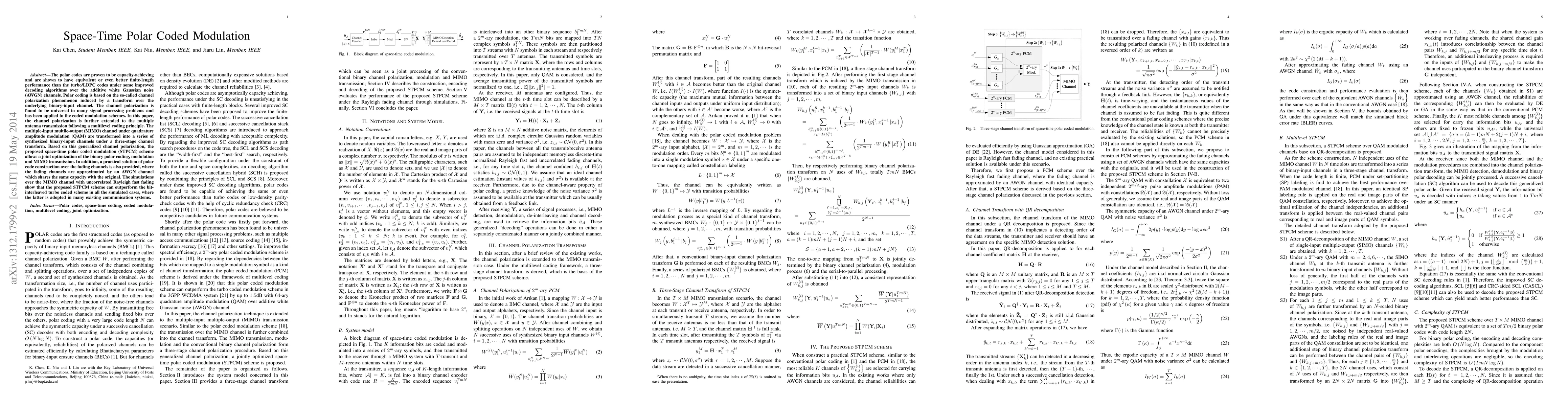The polar codes are proven to be capacity-achieving and are shown to have equivalent or even better finite-length performance than the turbo/LDPC codes under some improved decoding algorithms over the additive white Gaussian noise (AWGN) channels. Polar coding is based on the so-called channel polarization phenomenon induced by a transform over the underlying binary-input channel. The channel polarization is found to be universal in many signal processing problems and has been applied to the coded modulation schemes. In this paper, the channel polarization is further extended to the multiple antenna transmission following a multilevel coding principle. The multiple-input multile-output (MIMO) channel under quadrature amplitude modulation (QAM) are transformed into a series of synthesized binary-input channels under a three-stage channel transform. Based on this generalized channel polarization, the proposed space-time polar coded modulation (STPCM) scheme allows a joint optimization of the binary polar coding, modulation and MIMO transmission. In addition, a practical solution of polar code construction over the fading channels is also provided, where the fading channels are approximated by an AWGN channel which shares the same capacity with the original. The simulations over the MIMO channel with uncorrelated Rayleigh fast fading show that the proposed STPCM scheme can outperform the bit-interleaved turbo coded scheme in all the simulated cases, where the latter is adopted in many existing communication systems.