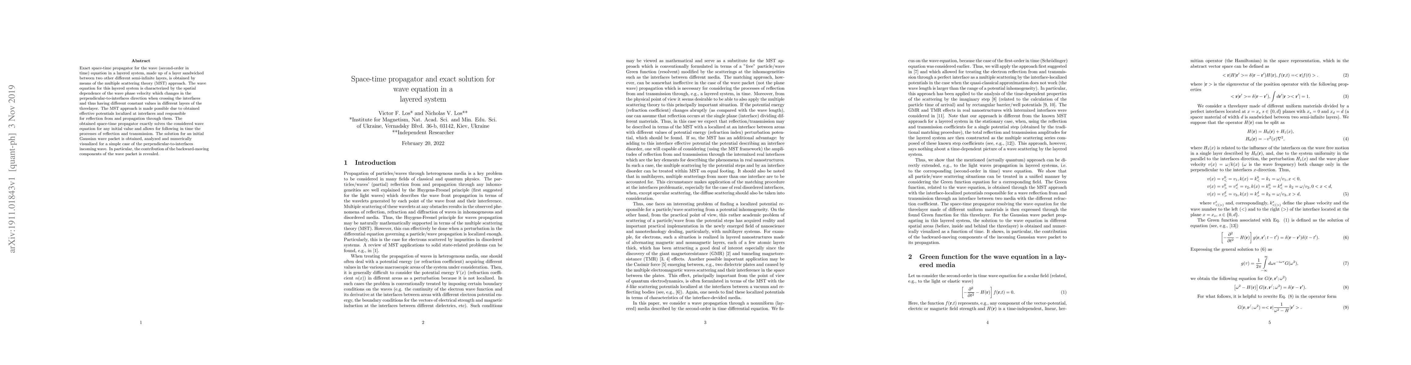 This paper presents an exact space-time propagator for the wave equation in a layered system using multiple scattering theory. The solution allows for the analysis of reflection and transmission processes, with a focus on the behavior of a Gaussian wave packet in a three-layer system.