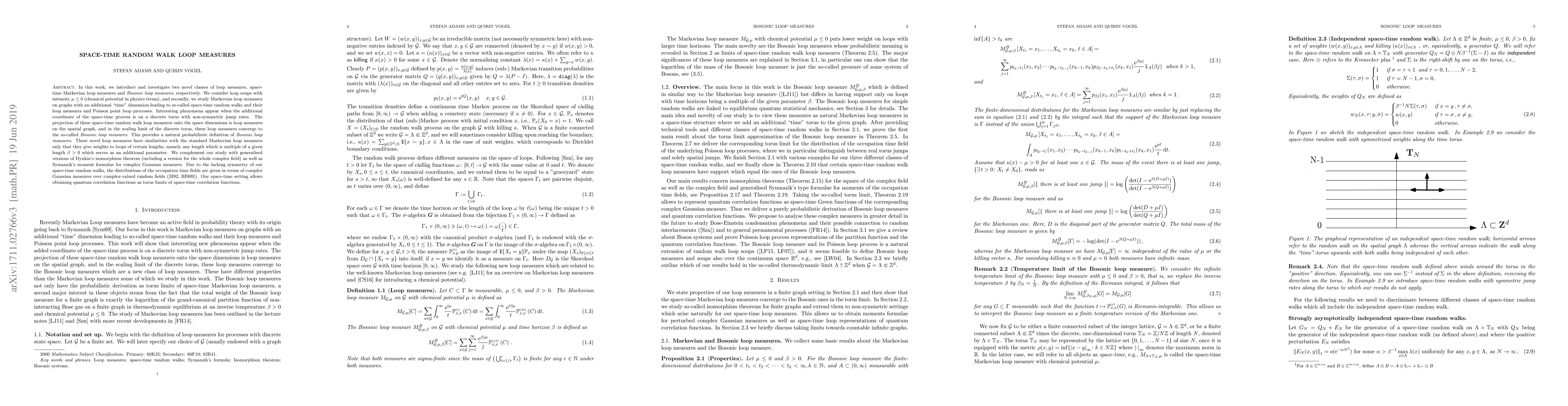 In this work, we investigate a novel setting of Markovian loop measures and introduce a new class of loop measures called Bosonic loop measures. Namely, we consider loop soups with varying intensity $ \mu\le 0 $ (chemical potential in physics terms), and secondly, we study Markovian loop measures on graphs with an additional "time" dimension leading to so-called space-time random walks and their loop measures and Poisson point loop processes. Interesting phenomena appear when the additional coordinate of the space-time process is on a discrete torus with non-symmetric jump rates. The projection of these space-time random walk loop measures onto the space dimensions is loop measures on the spatial graph, and in the scaling limit of the discrete torus, these loop measures converge to the so-called [Bosonic loop measures]. This provides a natural probabilistic definition of [Bosonic loop measures]. These novel loop measures have similarities with the standard Markovian loop measures only that they give weights to loops of certain lengths, namely any length which is multiple of a given length $ \beta> 0 $ which serves as an additional parameter. We complement our study with generalised versions of Dynkin's isomorphism theorem (including a version for the whole complex field) as well as Symanzik's moment formulae for complex Gaussian measures. Due to the lacking symmetry of our space-time random walks, the distributions of the occupation time fields are given in terms of complex Gaussian measures over complex-valued random fields ([B92,BIS09]. Our space-time setting allows obtaining quantum correlation functions as torus limits of space-time correlation functions.