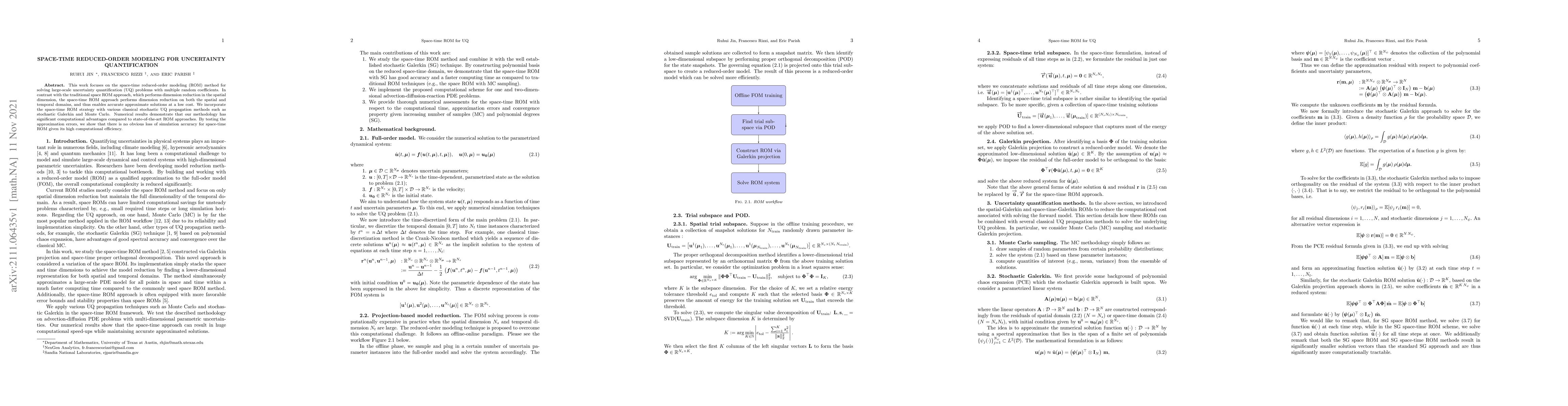 This paper introduces a space-time reduced-order modeling (ROM) method for large-scale uncertainty quantification (UQ) problems, achieving dimension reduction in both spatial and temporal domains for accurate, cost-effective solutions. It combines this approach with classical stochastic UQ methods and demonstrates superior computational efficiency without sacrificing accuracy.